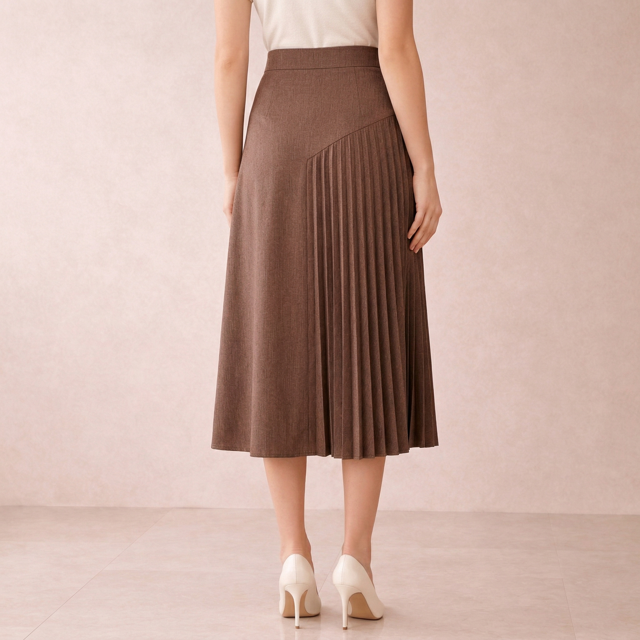 A modern midi skirt featuring a unique asymmetrical design with elegant pleated detailing. Perfect for adding texture and sophistication to your everyday wardrobe.