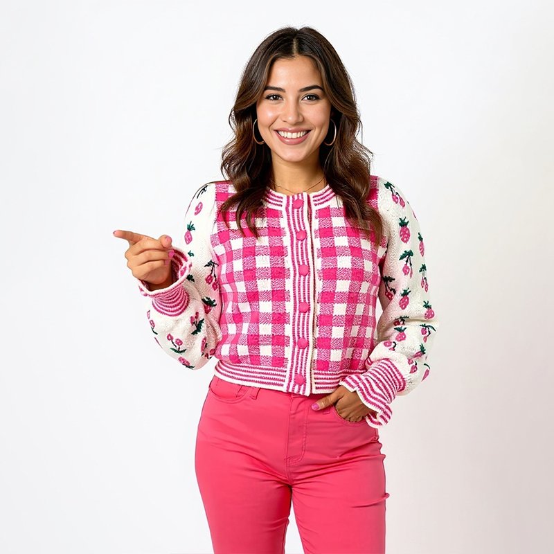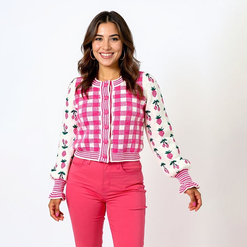 This cheerful gingham cardigan is a joyful layering piece that instantly adds charm to your outfit. With its detailed strawberry and cherry embroidery, it’s the perfect piece to wear for worship, brunch with friends, or casual days when you want to feel pulled together and pretty. Pair it with high-waisted denim, skirts, or even tailored pants for a versatile look you can dress up or down.- Model is 5'6" wearing a size Small. You can select your height before purchase for the perfect fit.
