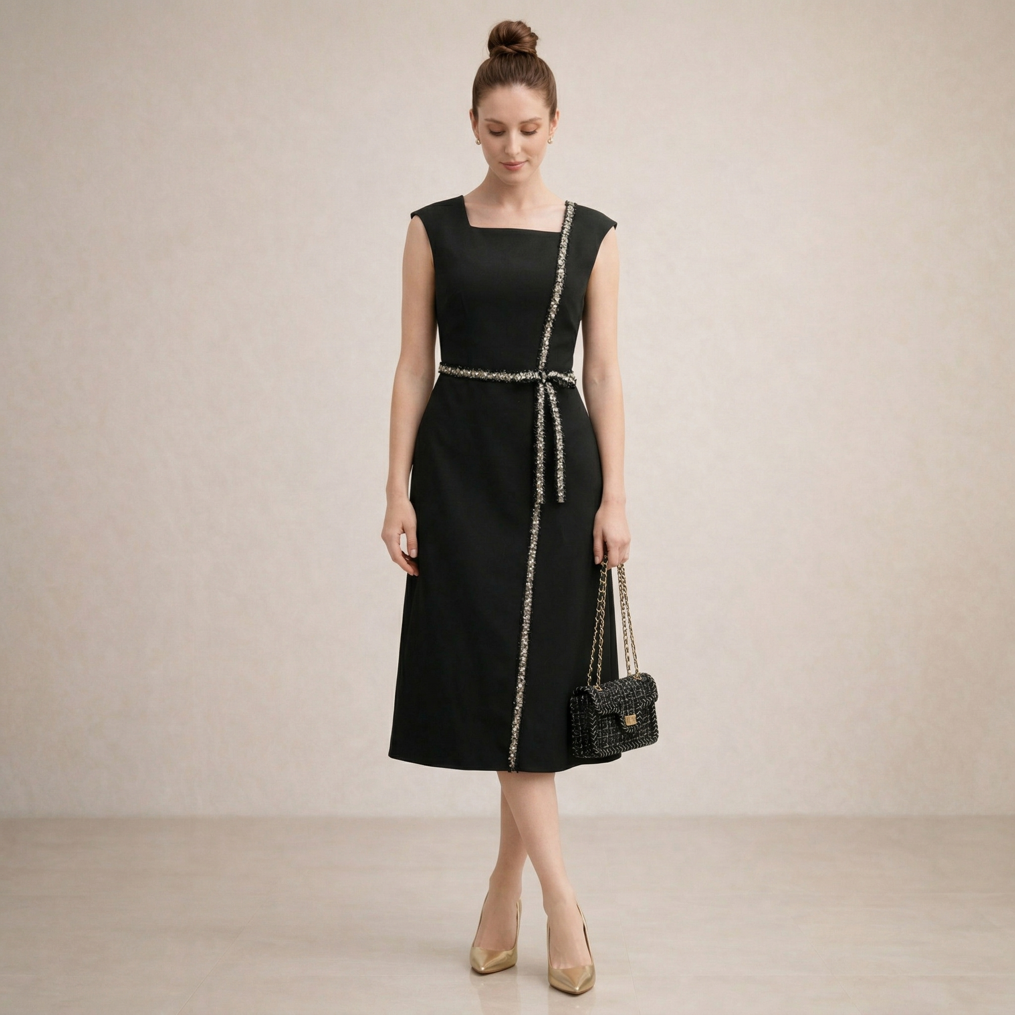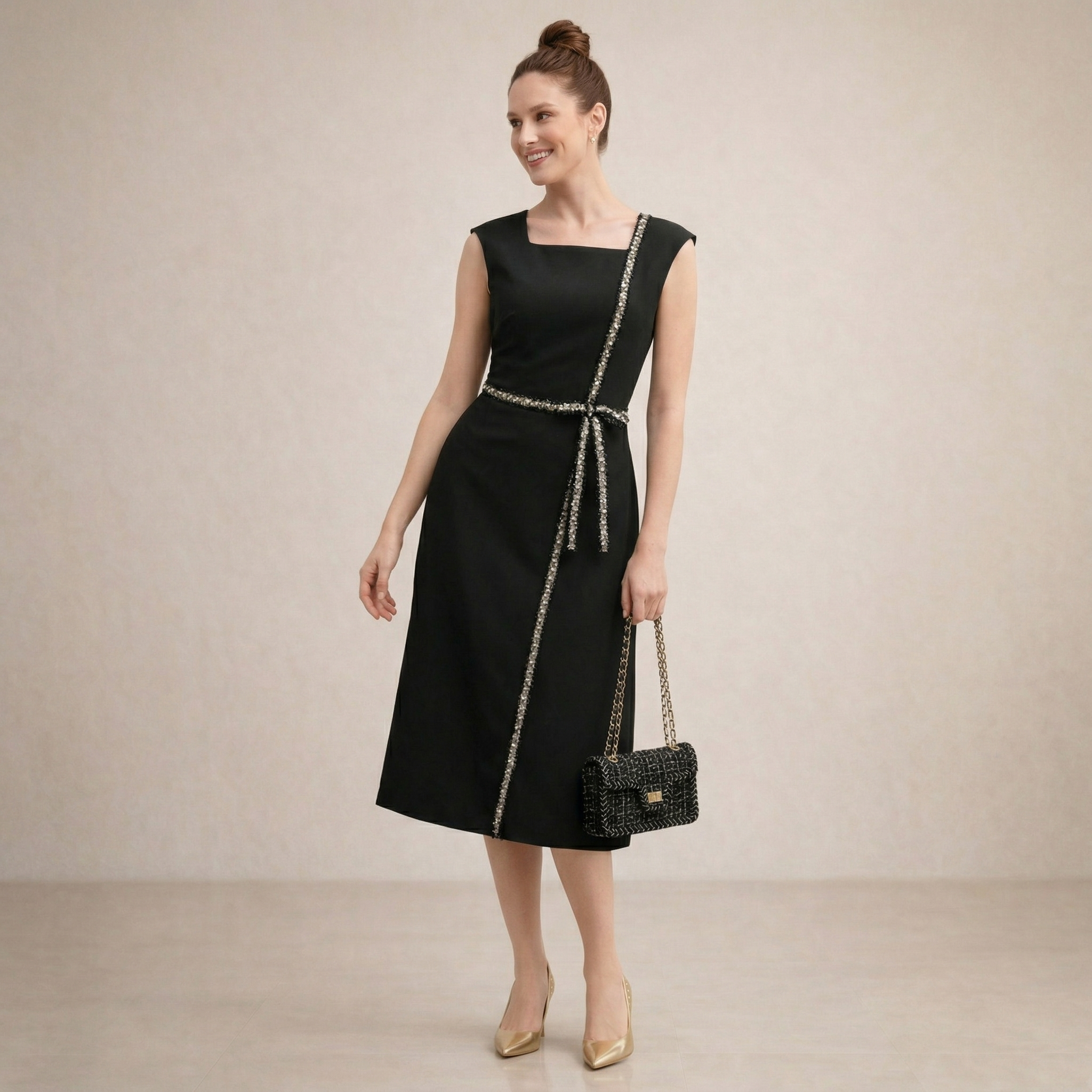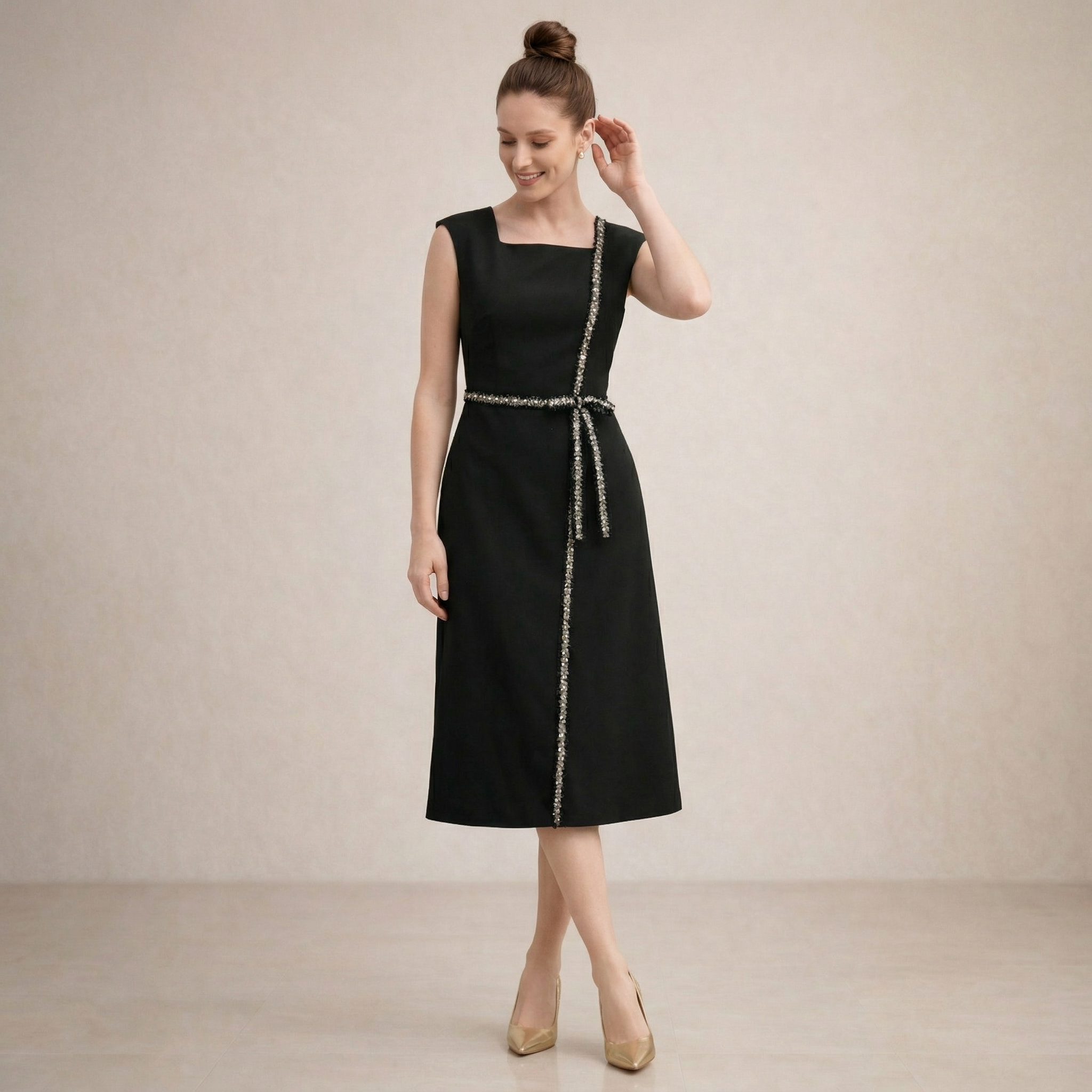 A sophisticated black midi dress featuring elegant embellished trim detailing for a refined finish. Perfect for evening events and special occasions.