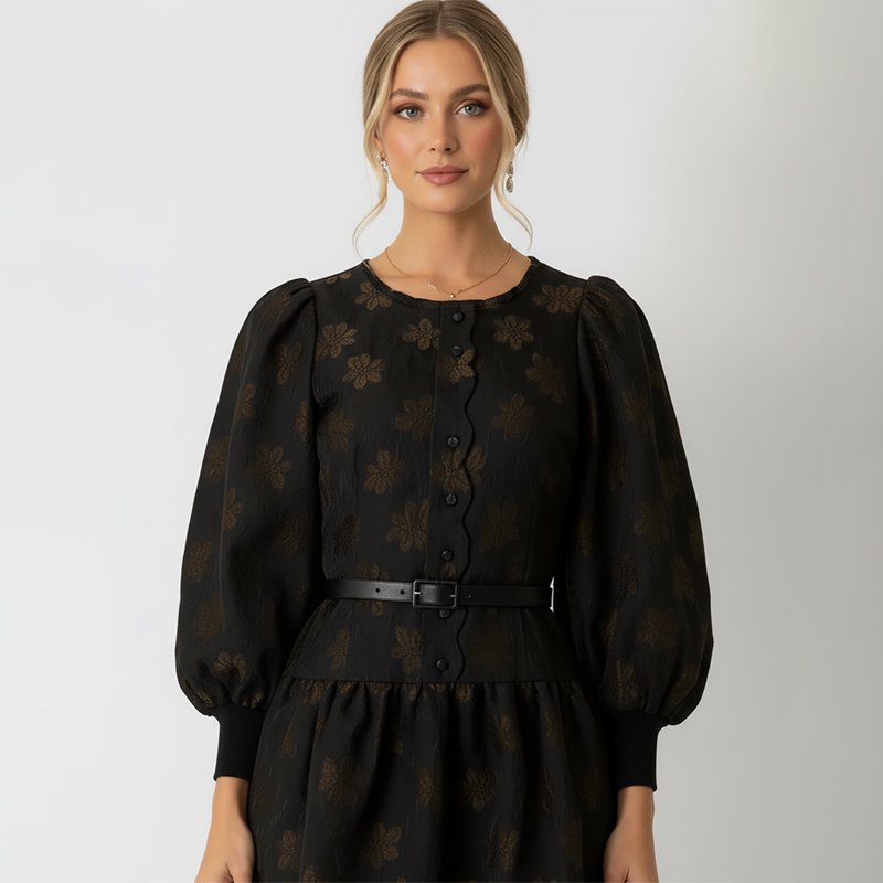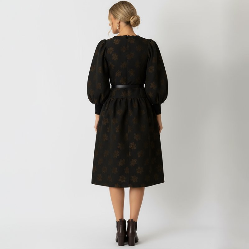 Step out in timeless style with this jacquard floral midi dress, crafted for both elegance and versatility.-