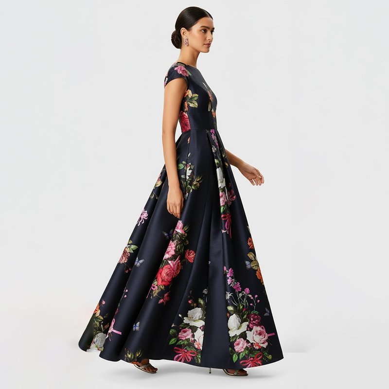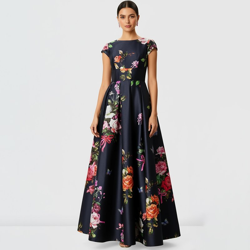 A stunning black maxi dress with bold floral prints, cap sleeves, and a flowing A-line silhouette. Perfect for weddings, evening events, and special occasions.