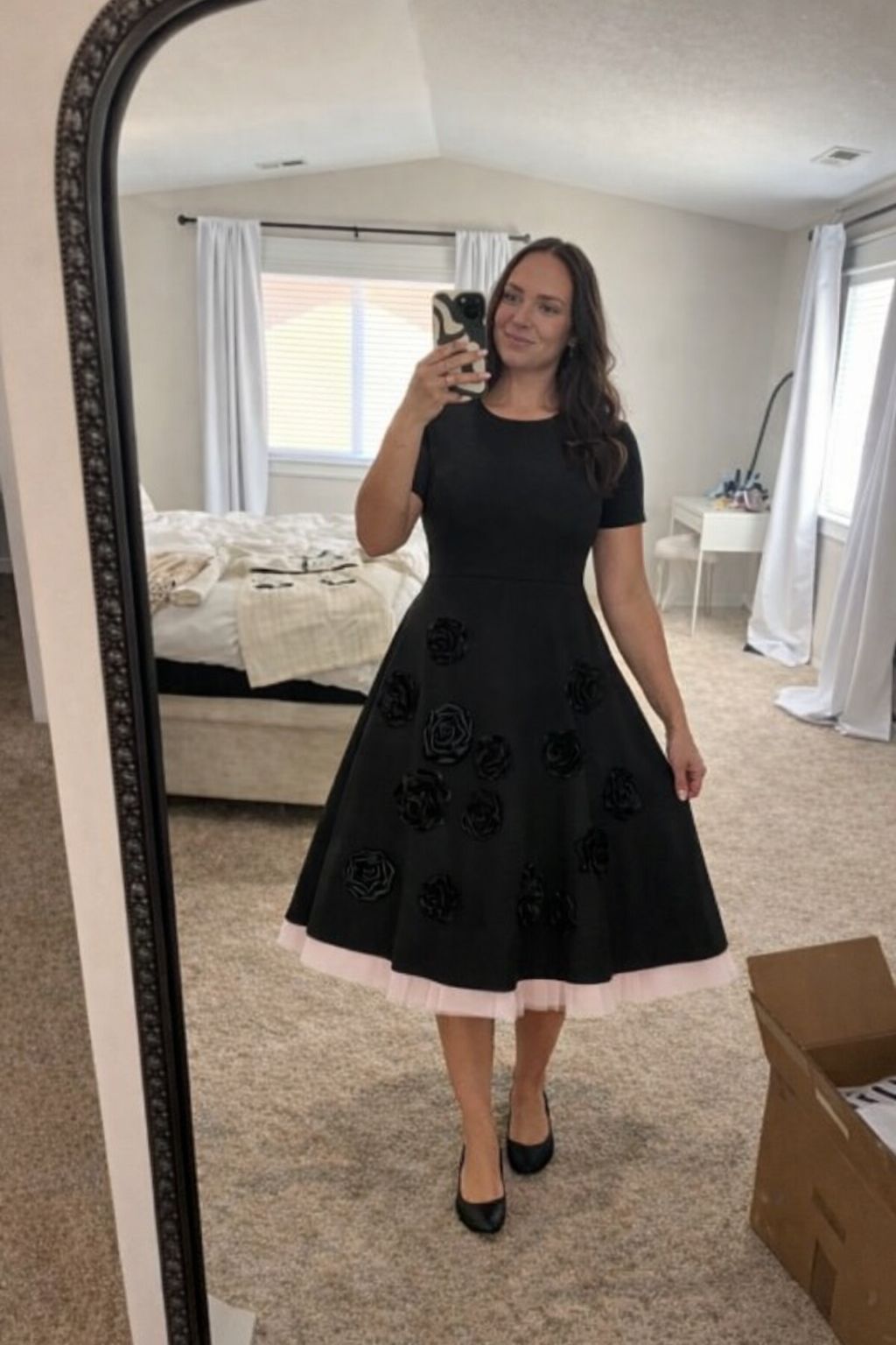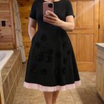 Floral Appliqué Black Midi Dress
