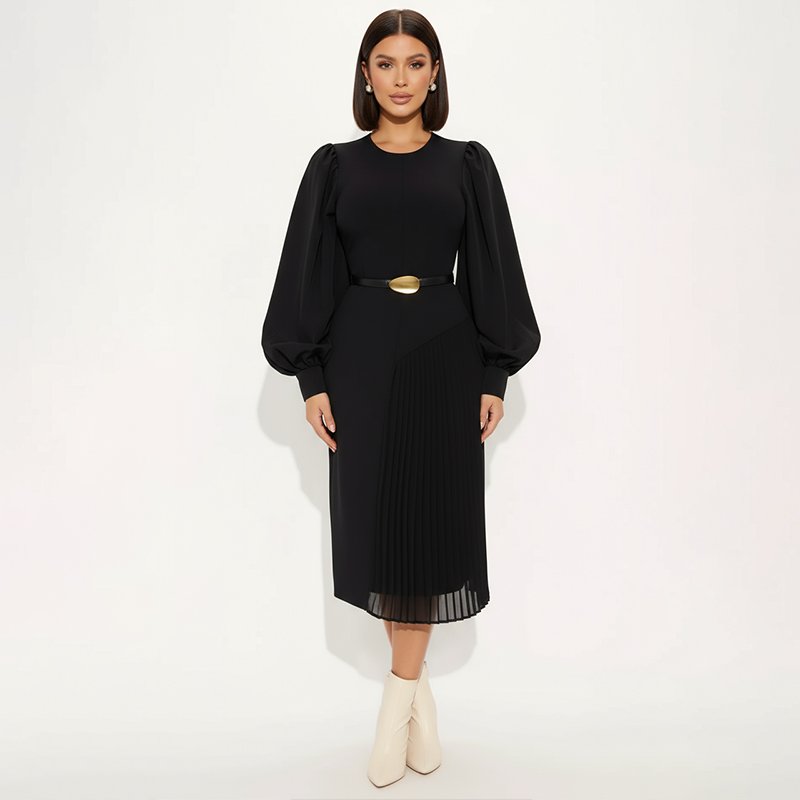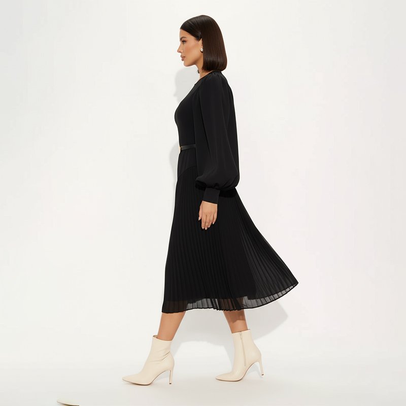 Step out with confidence in this pleated black midi dress designed to give you timeless sophistication and versatility for any occasion.-