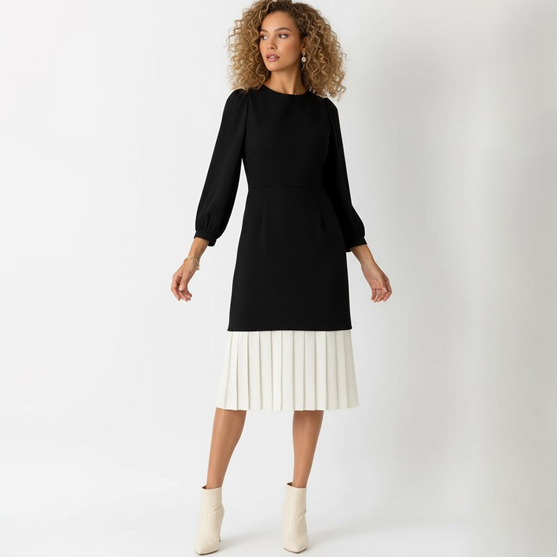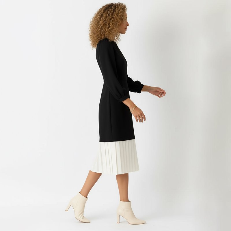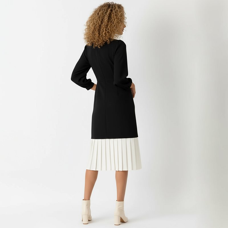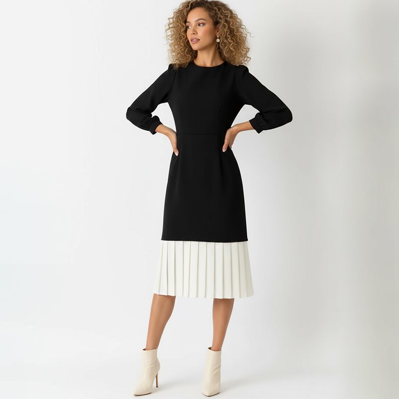 Step into timeless elegance with this black midi dress featuring a crisp white pleated hem for a refined, modern finish.-
