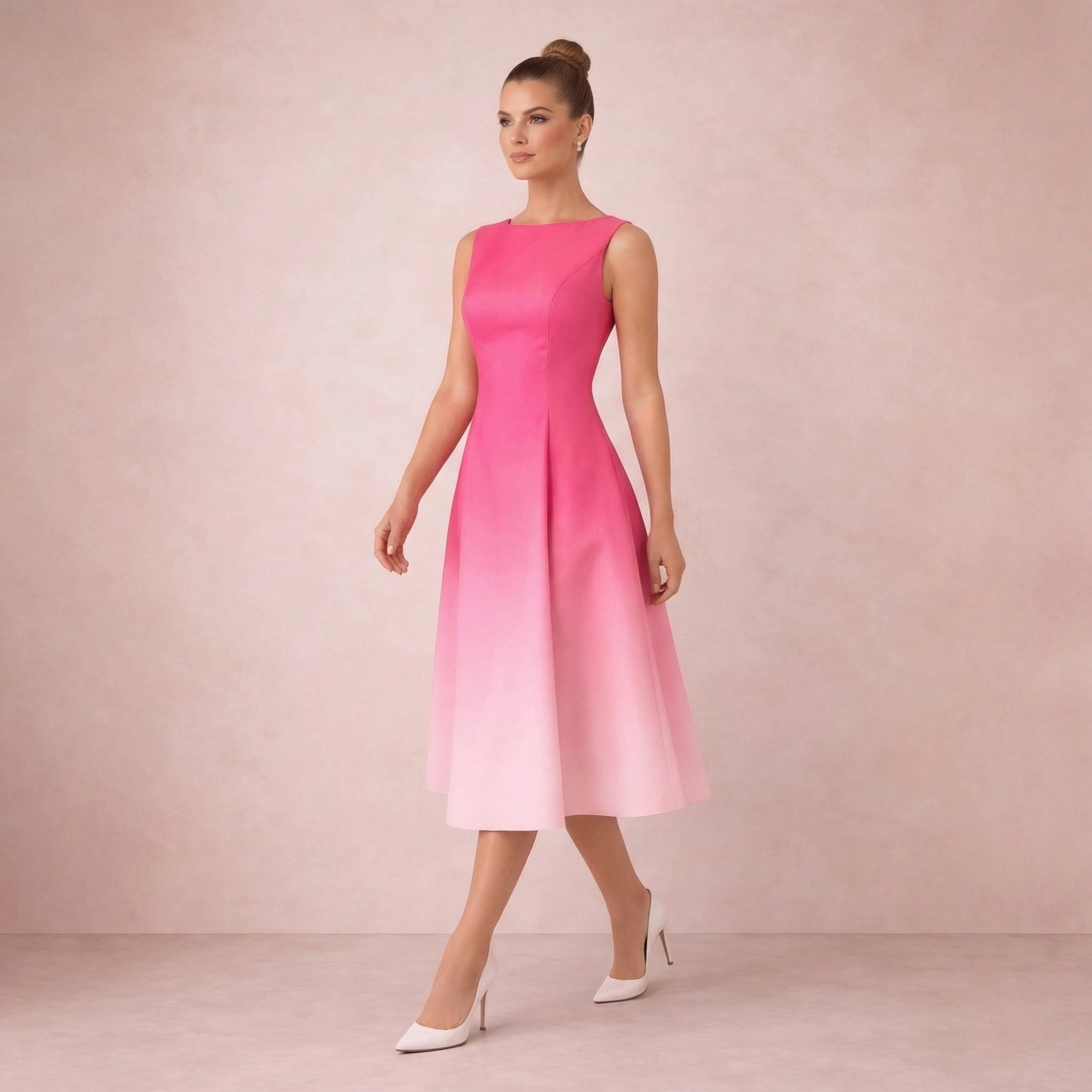 An elegant sleeveless midi dress featuring a stunning pink-to-blush ombré gradient. Perfect for for weddings, cocktail parties, or upscale spring events.