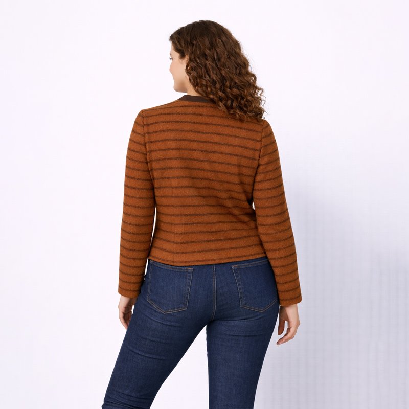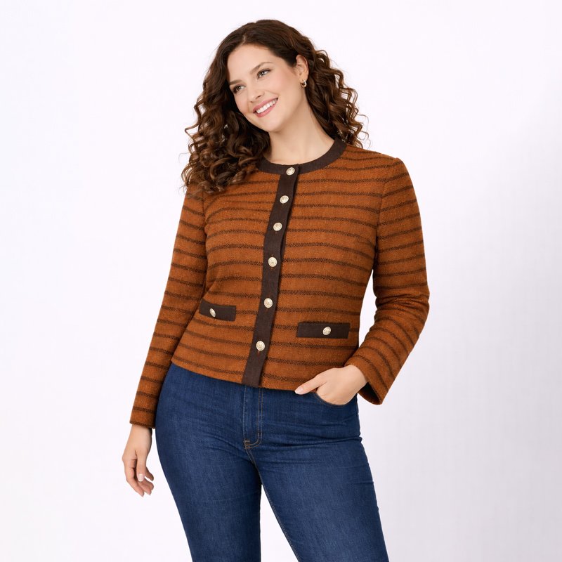This elegant brown striped knit jacket is perfect for office wear, casual outings, or family gatherings, it offers a polished yet approachable look. Pair it with jeans, trousers, or skirts for a refined, modern, and modest outfit.
