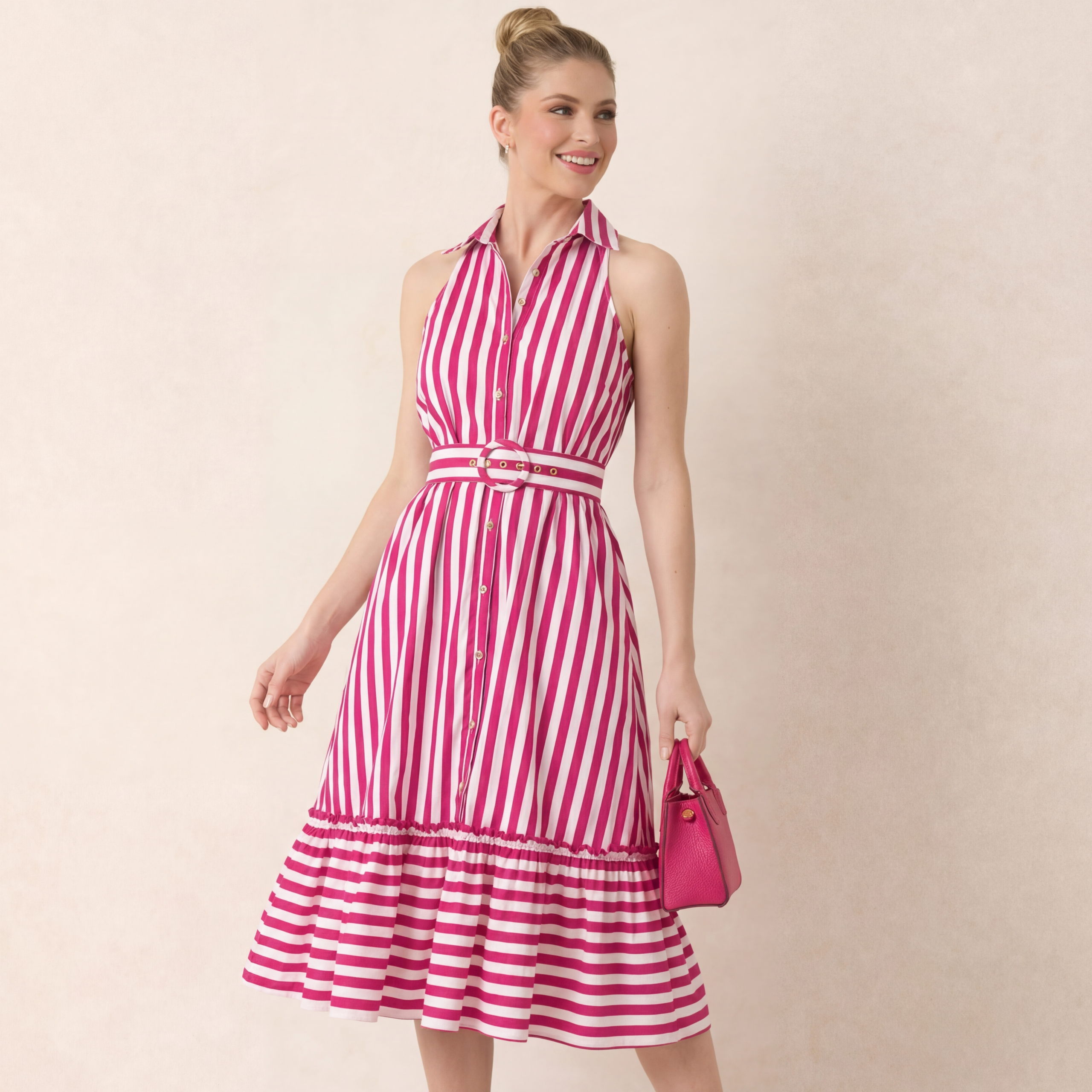 A playful striped midi dress with a flattering belted waist and flowy skirt. Perfect for brunch, vacations, or casual outings.