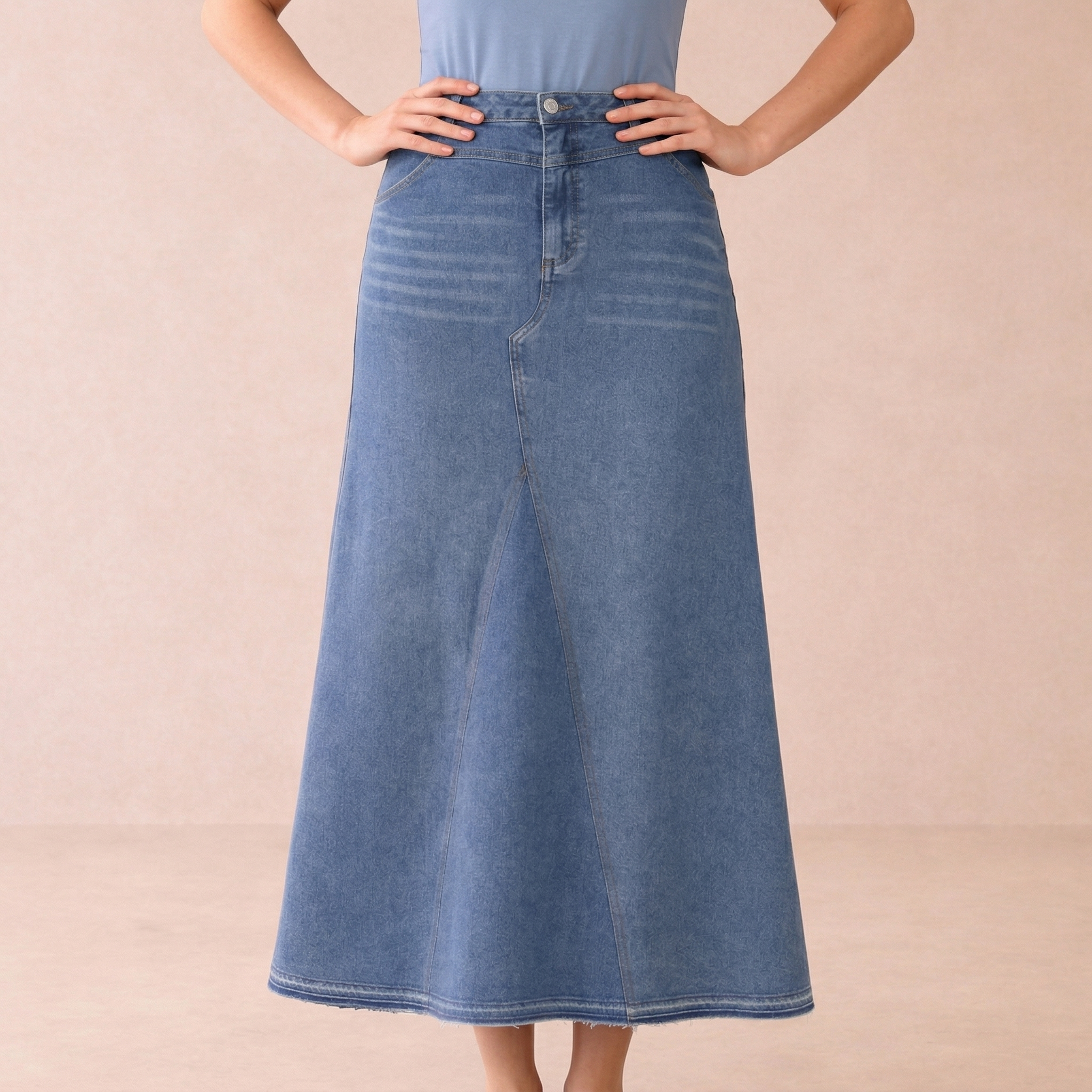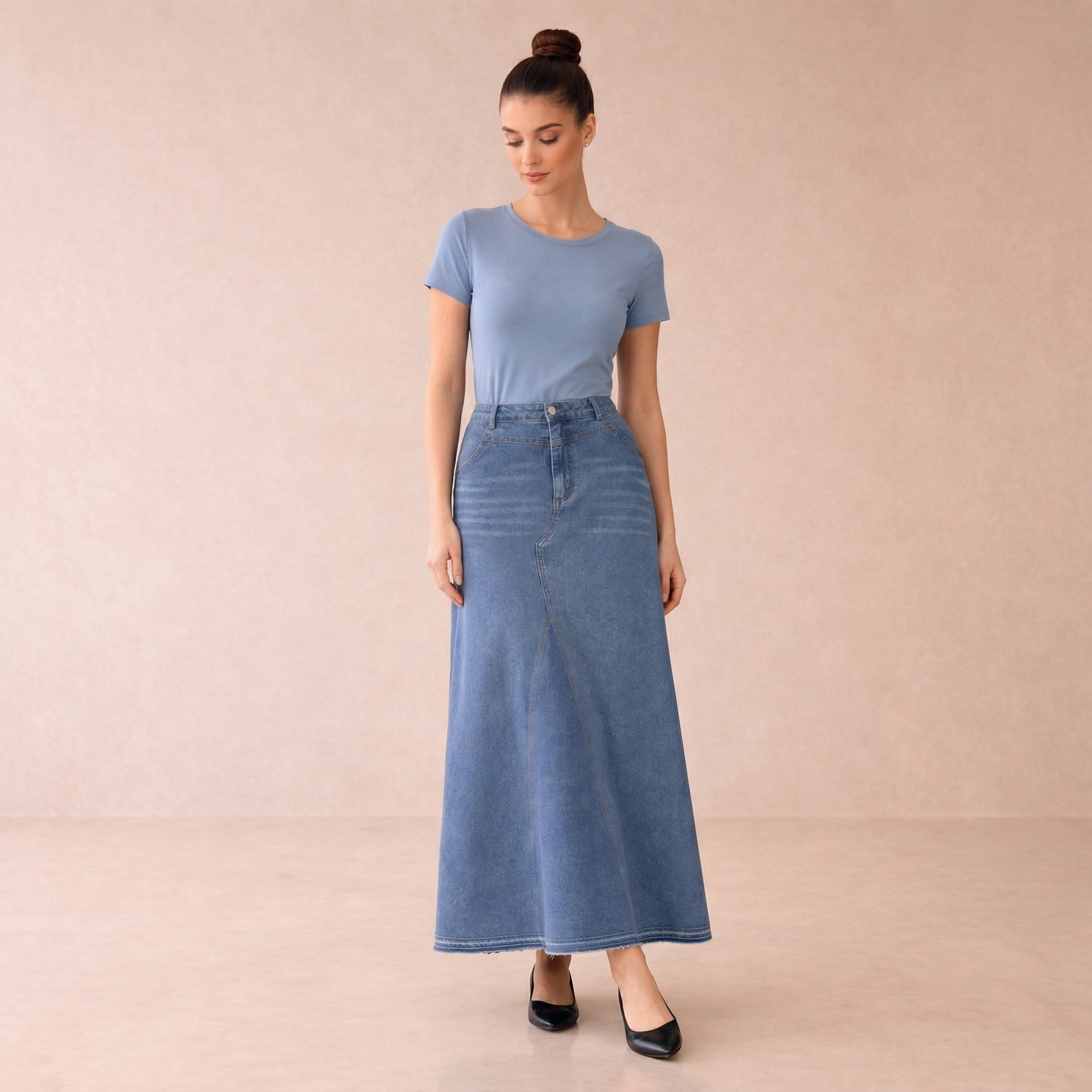 A timeless denim maxi skirt designed with a flattering A-line silhouette and structured waistband. Perfect for everyday wear, it offers a casual yet polished look.