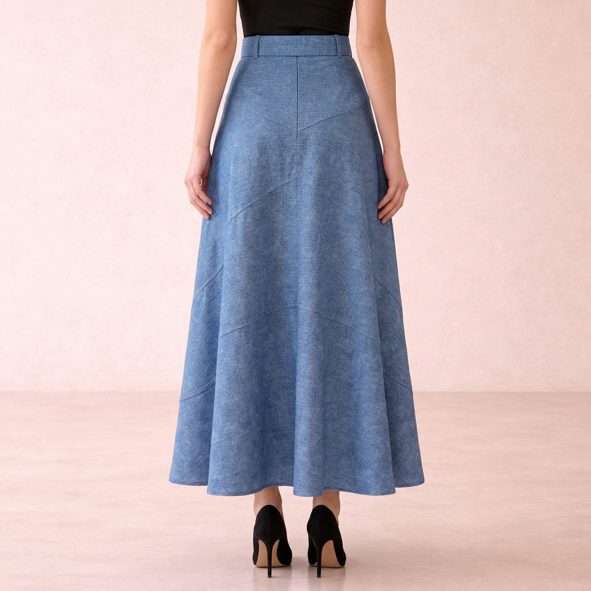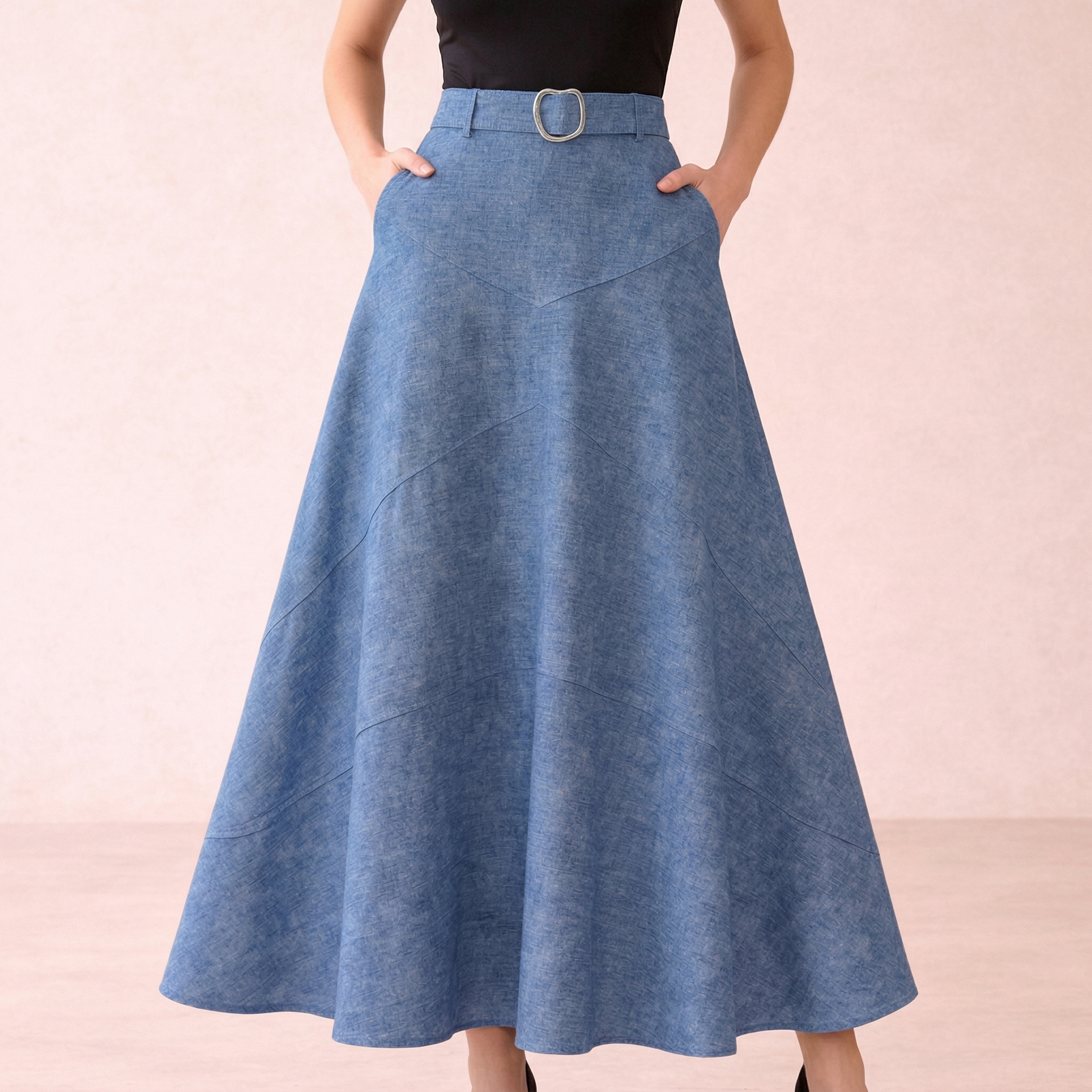 A timeless A-line maxi skirt featuring a structured denim-inspired look with a flattering belted waist. Perfect for effortless elegance with a modern touch.