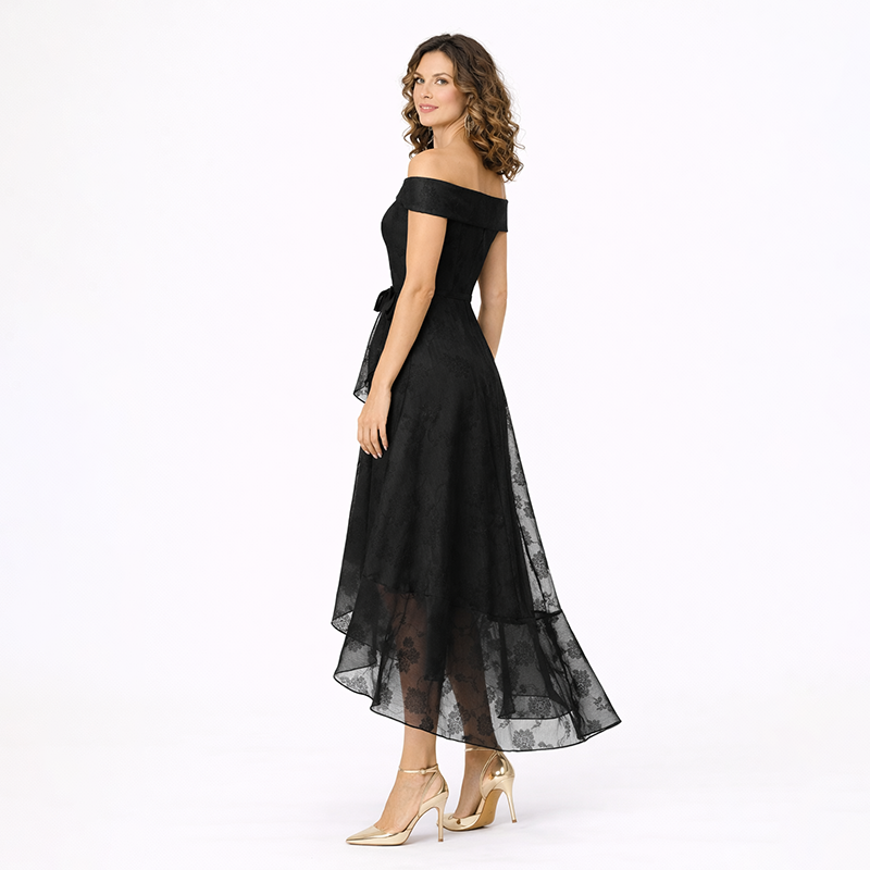 An elegant black off-shoulder dress designed with a flattering silhouette and soft flowing layers. Perfect for evening events, special occasions