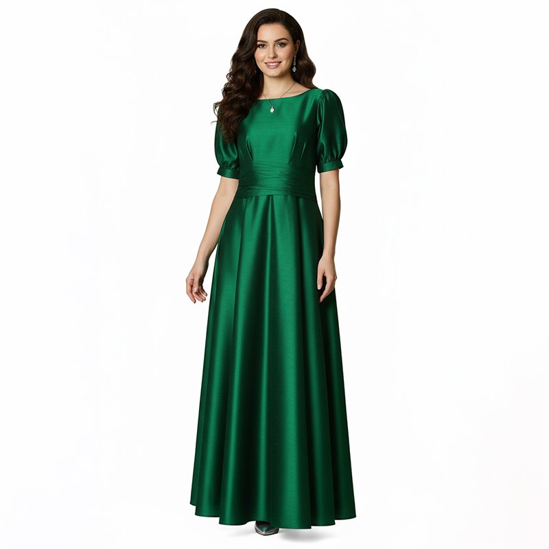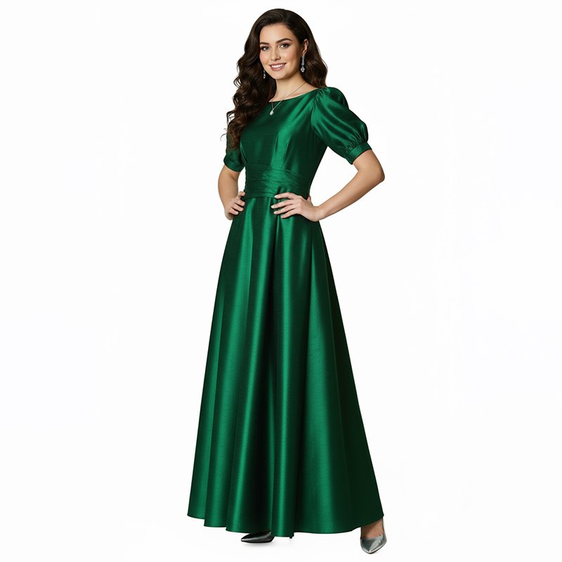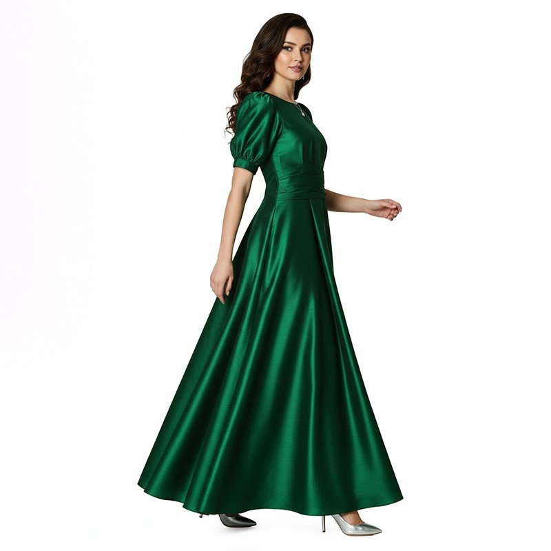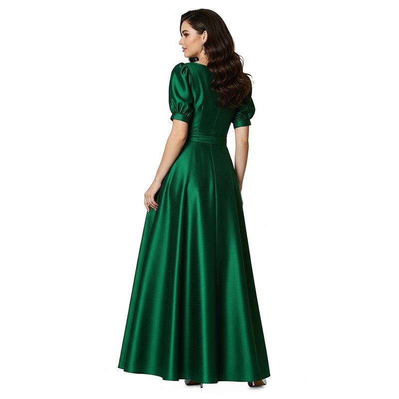 Make every entrance unforgettable in this puff-sleeve emerald gown, designed for timeless sophistication and all-night confidence.-