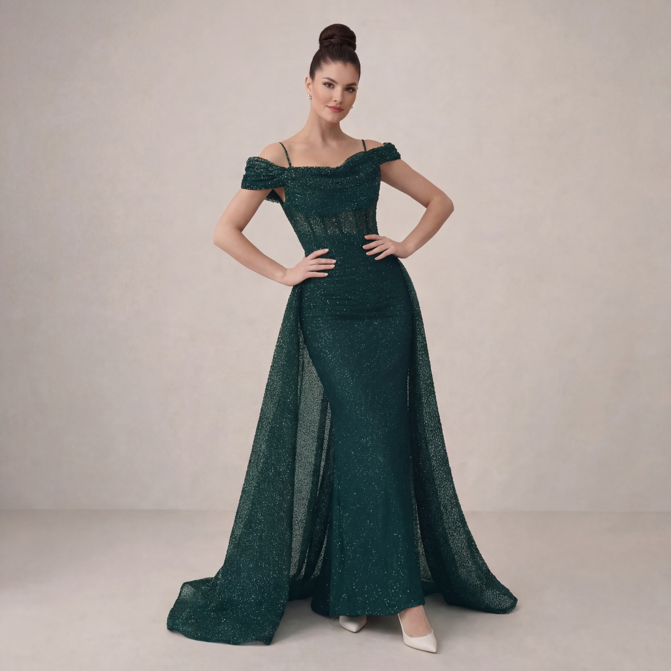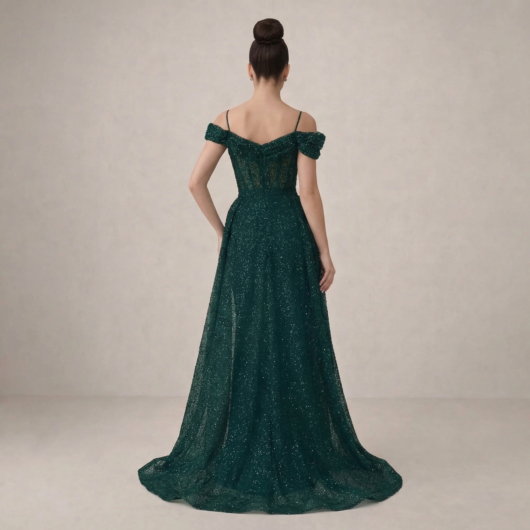 A stunning emerald gown with a sleek silhouette and elegant sparkle. Perfect for formal events and special occasions.