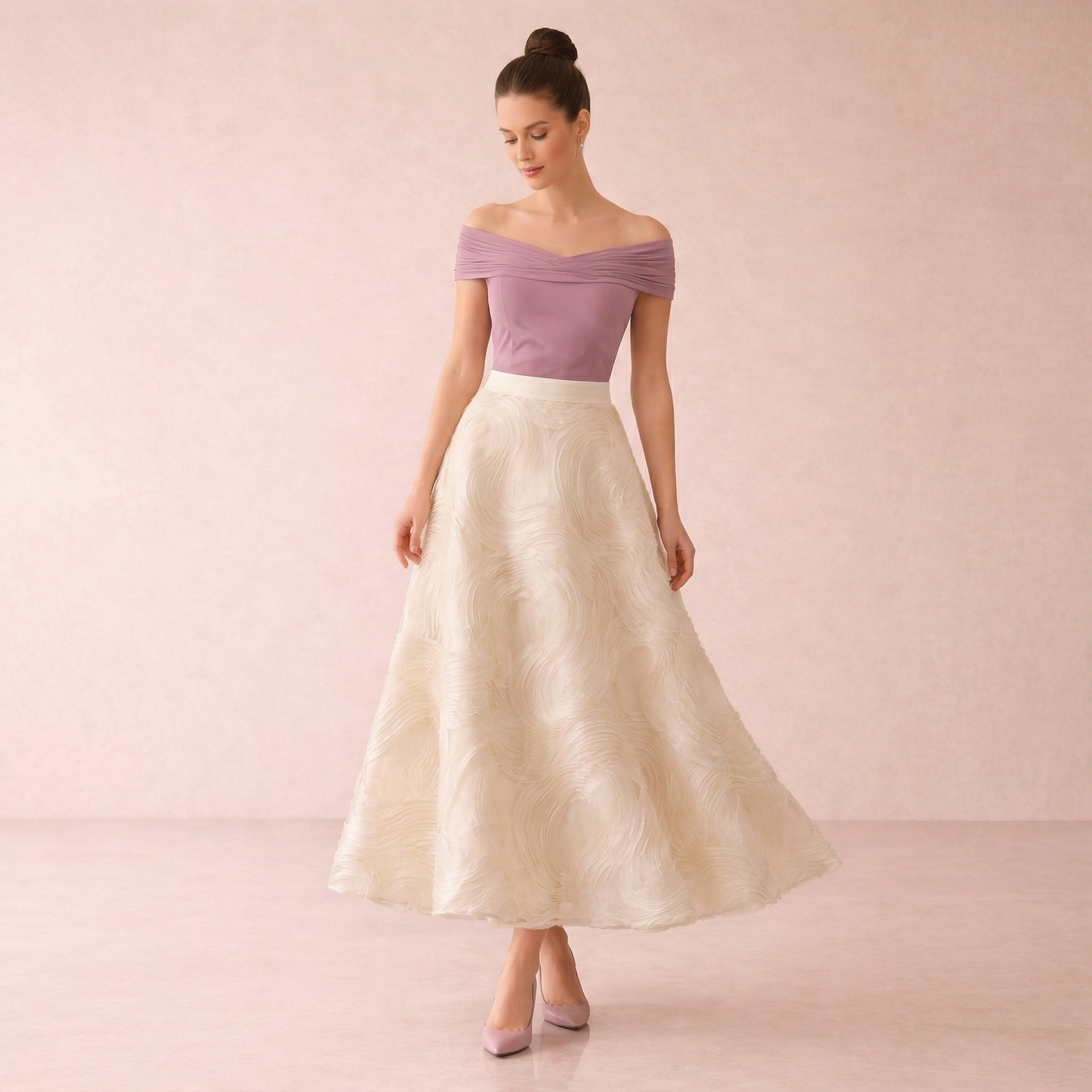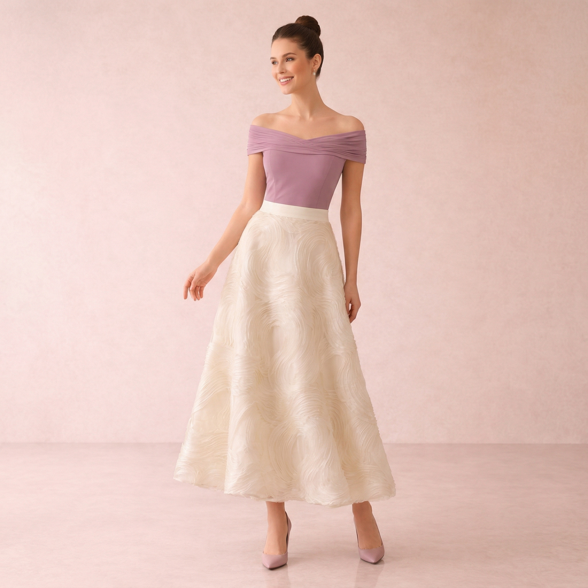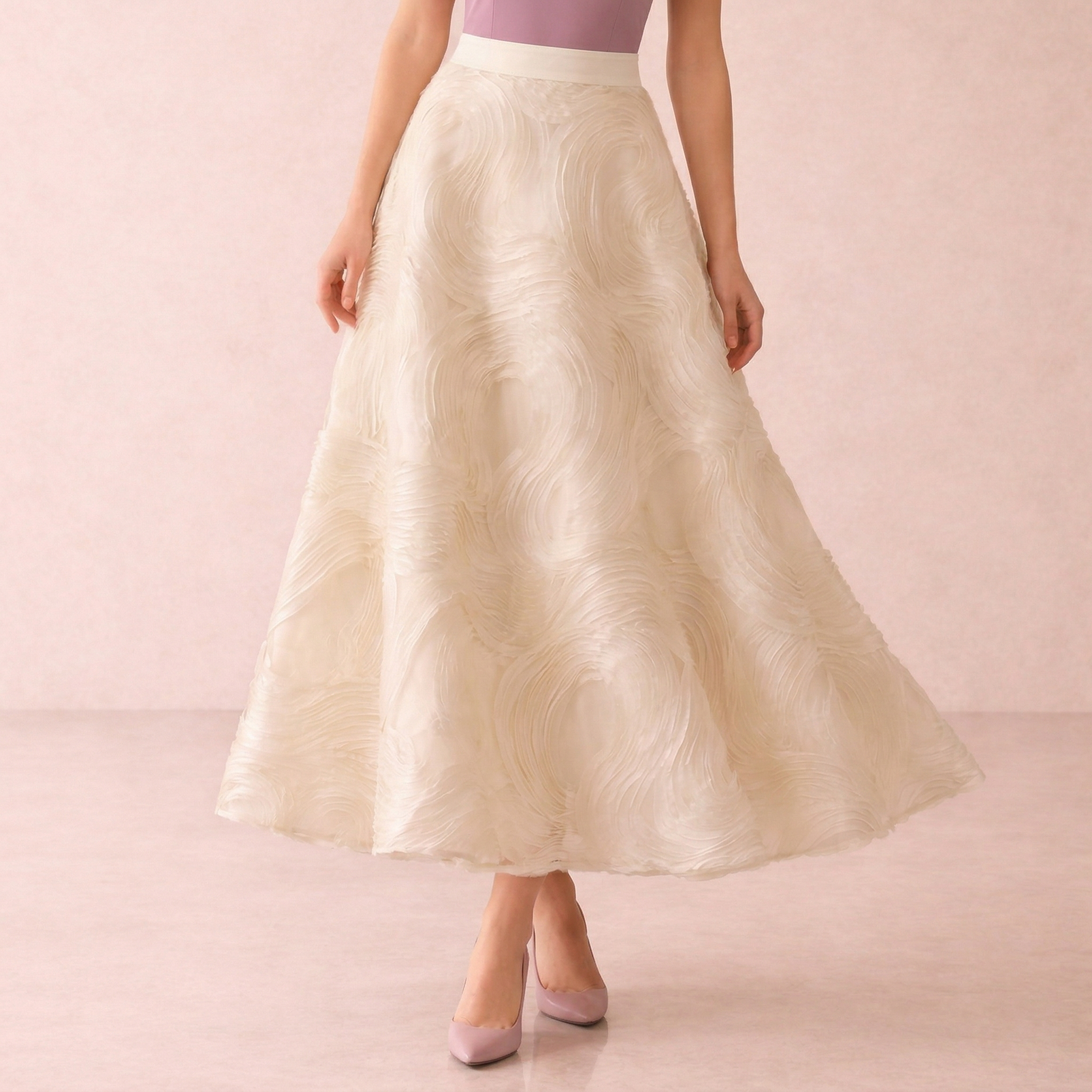 A graceful midi skirt featuring a soft textured swirl pattern that adds depth and elegance. Perfect for both formal and everyday refined styling.