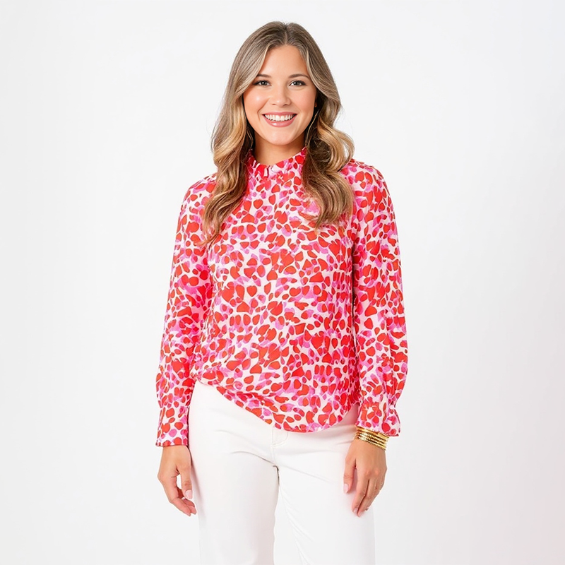 This vibrant blouse brings a cheerful spark to your wardrobe—perfect for brightening up your workdays, worship services, or weekend plans. The flirty heart-print pairs effortlessly with white pants, skirts, or denim, giving you a polished yet playful look you'll love reaching for again and again.-