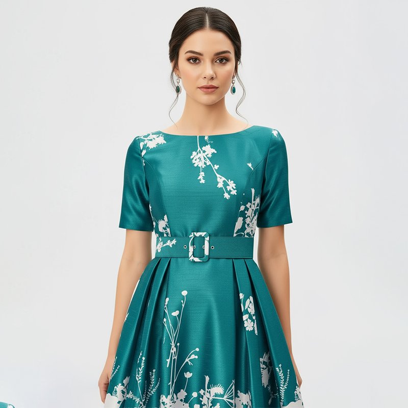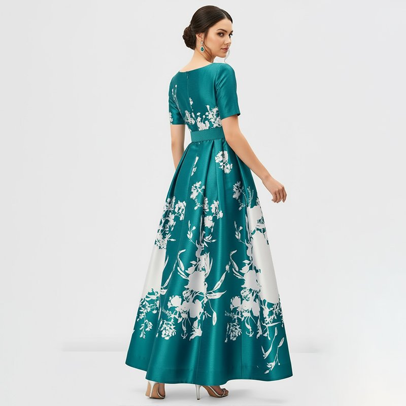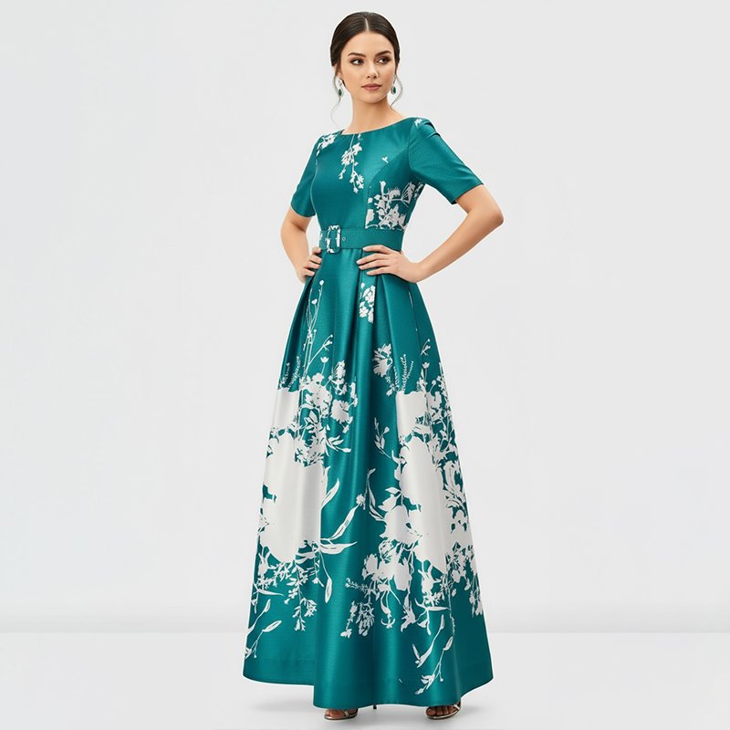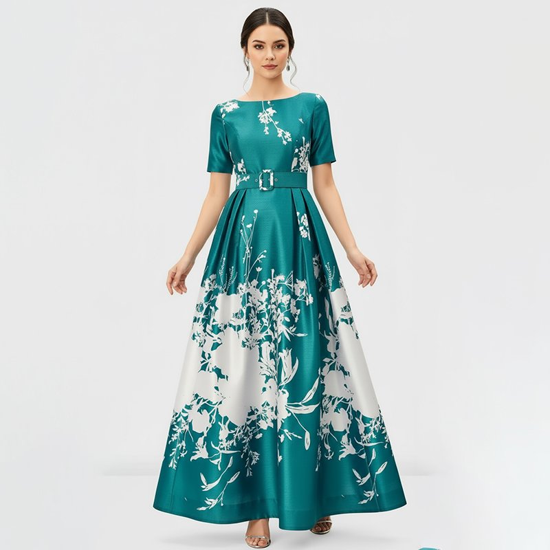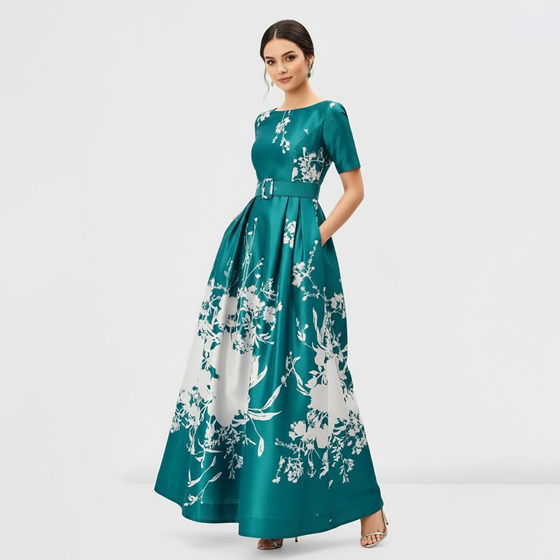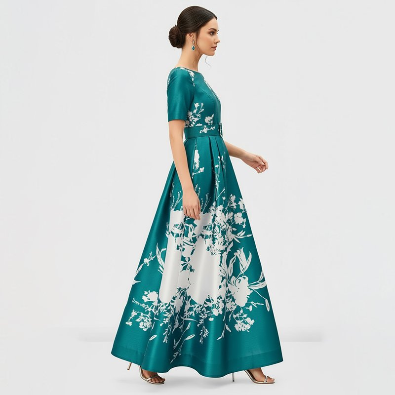 An elegant emerald green maxi dress with white floral prints, short sleeves, and a belted waist. Perfect for weddings, evening events, and special celebrations.-