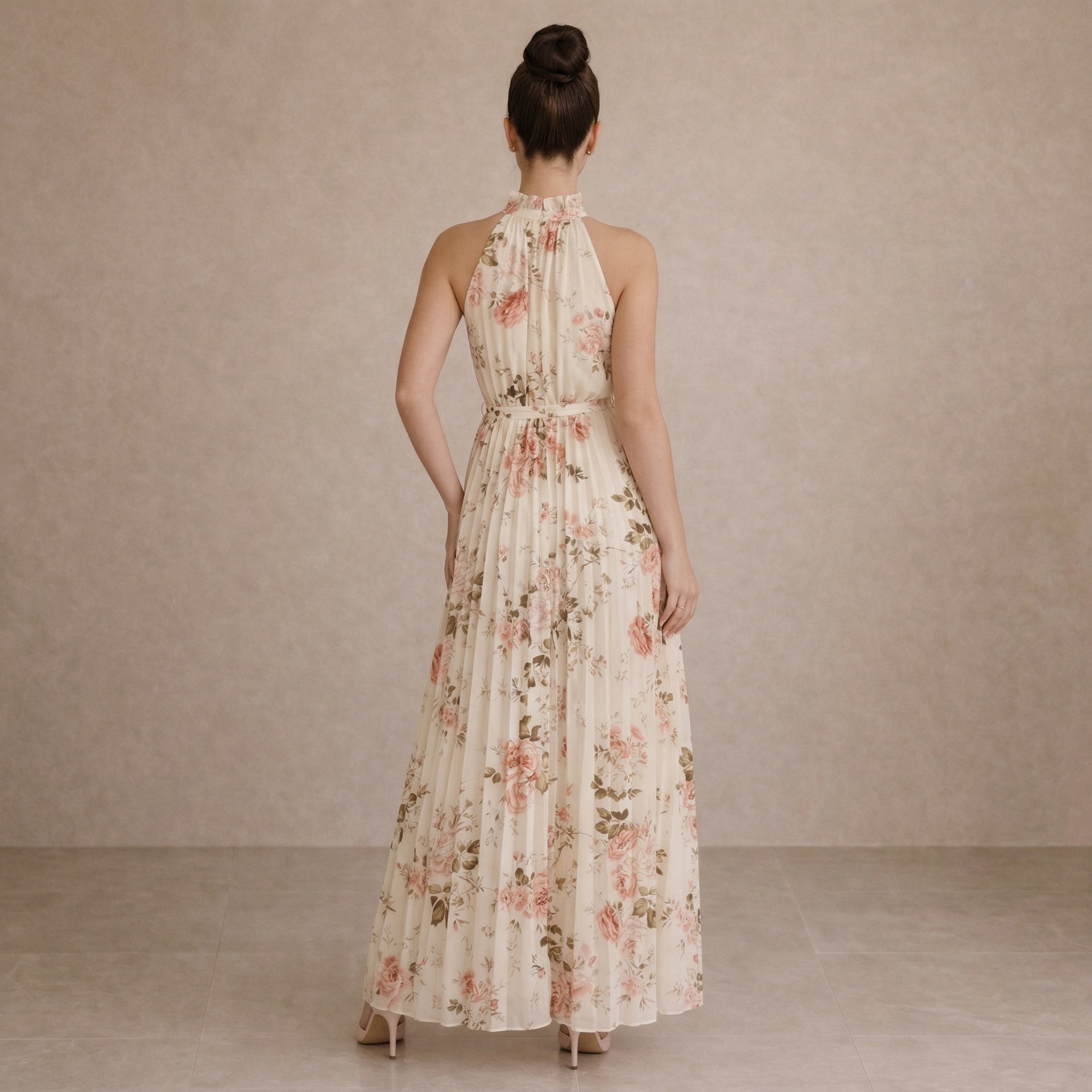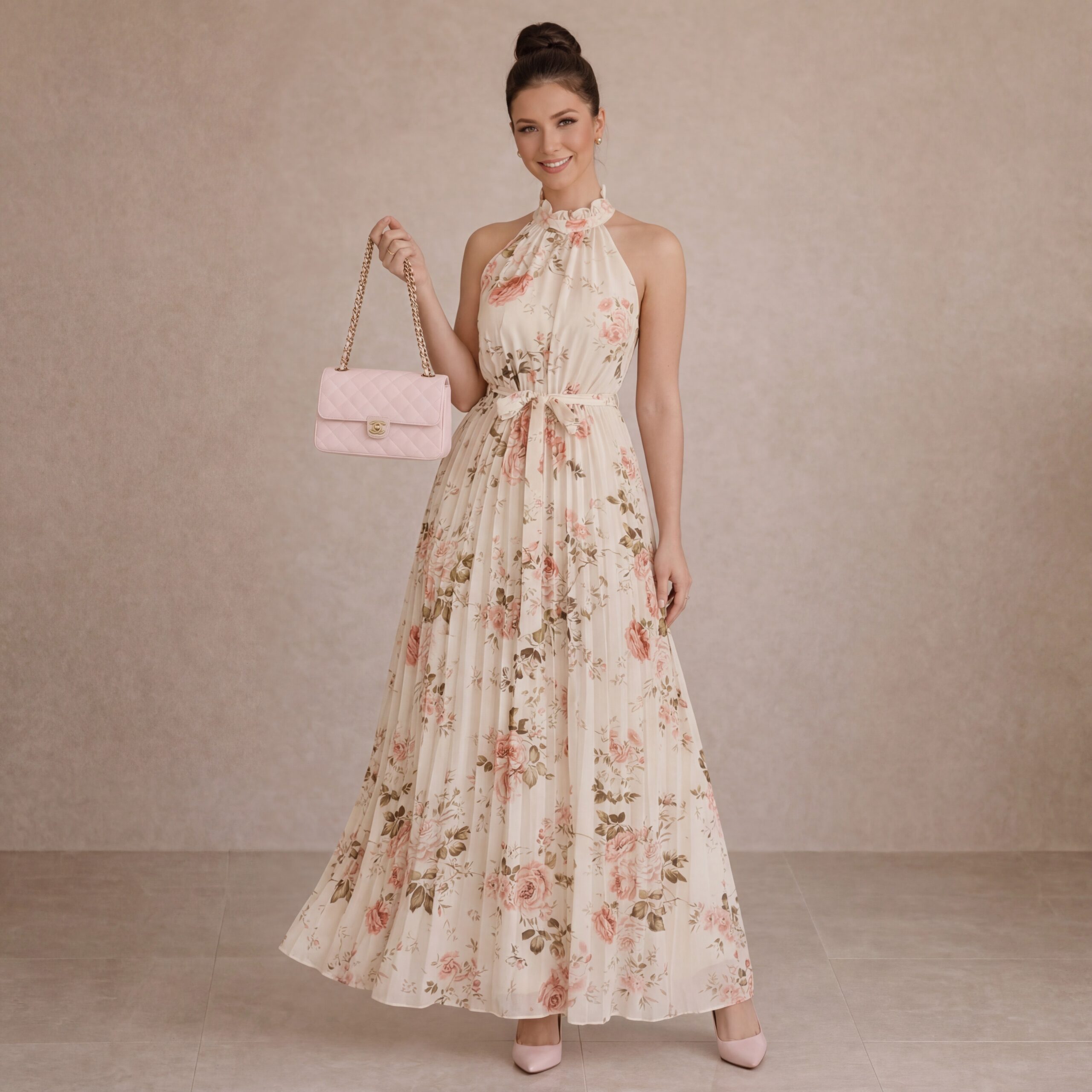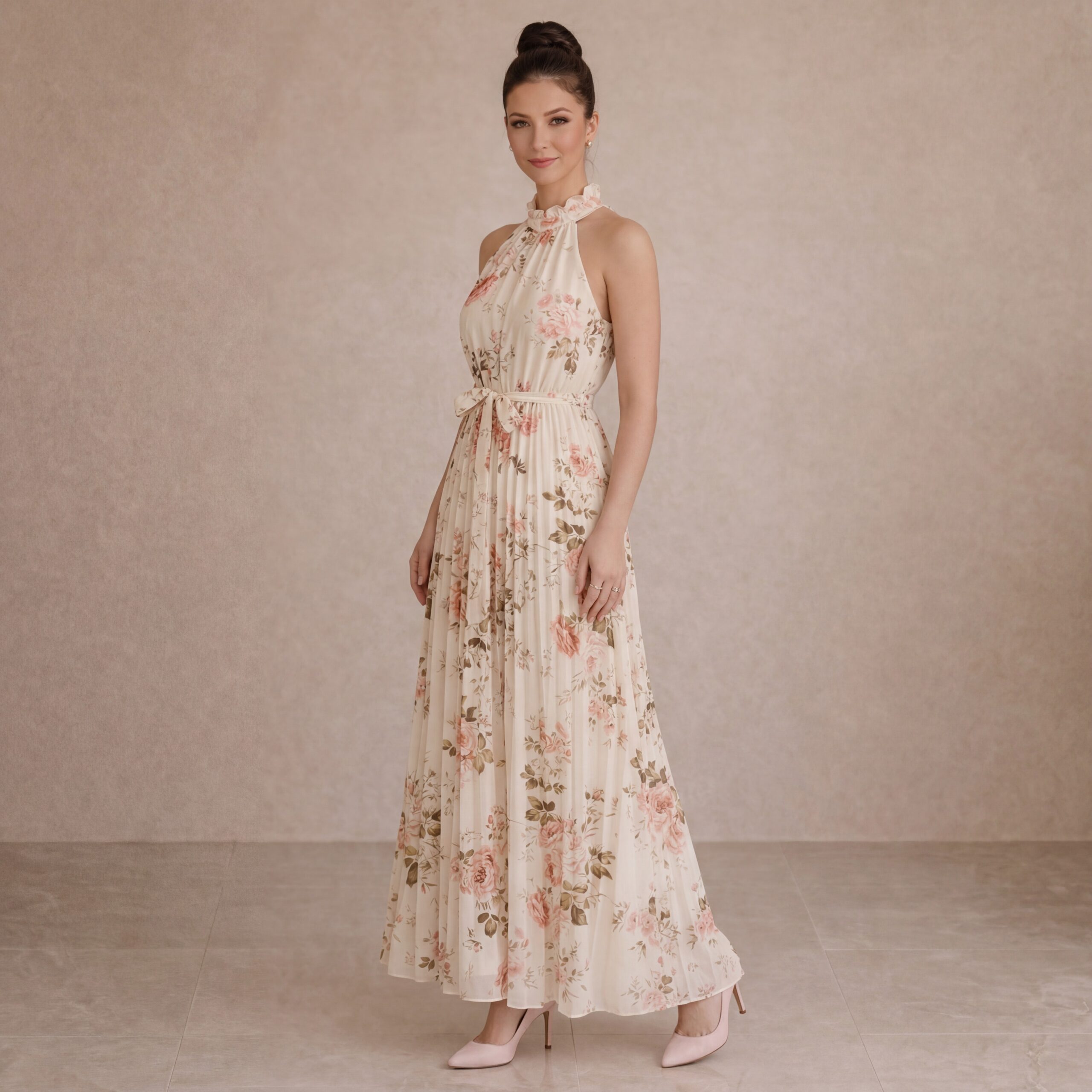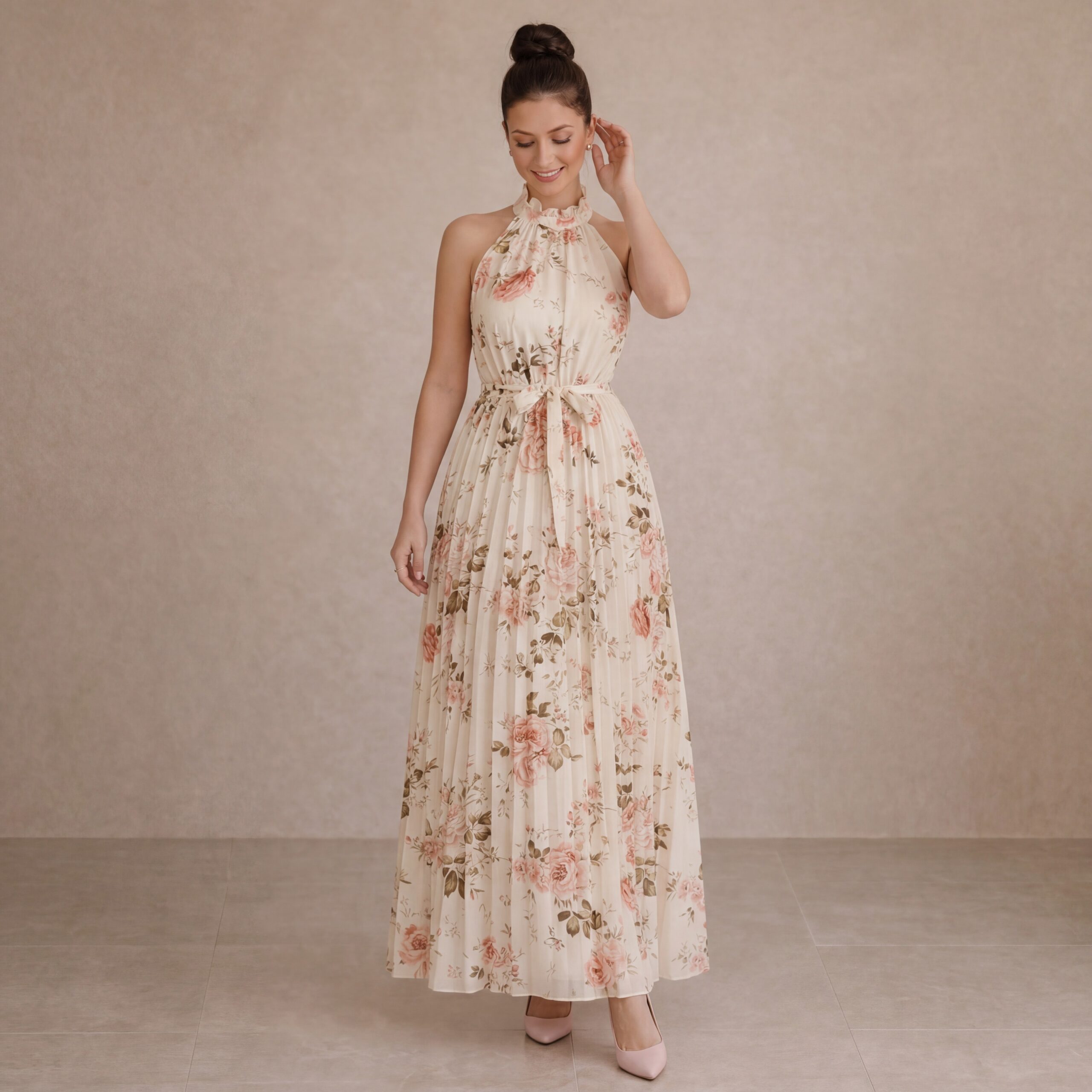 Elegant floral maxi dress with halter neckline and flowy pleats. Perfect for weddings, parties, or summer occasions.