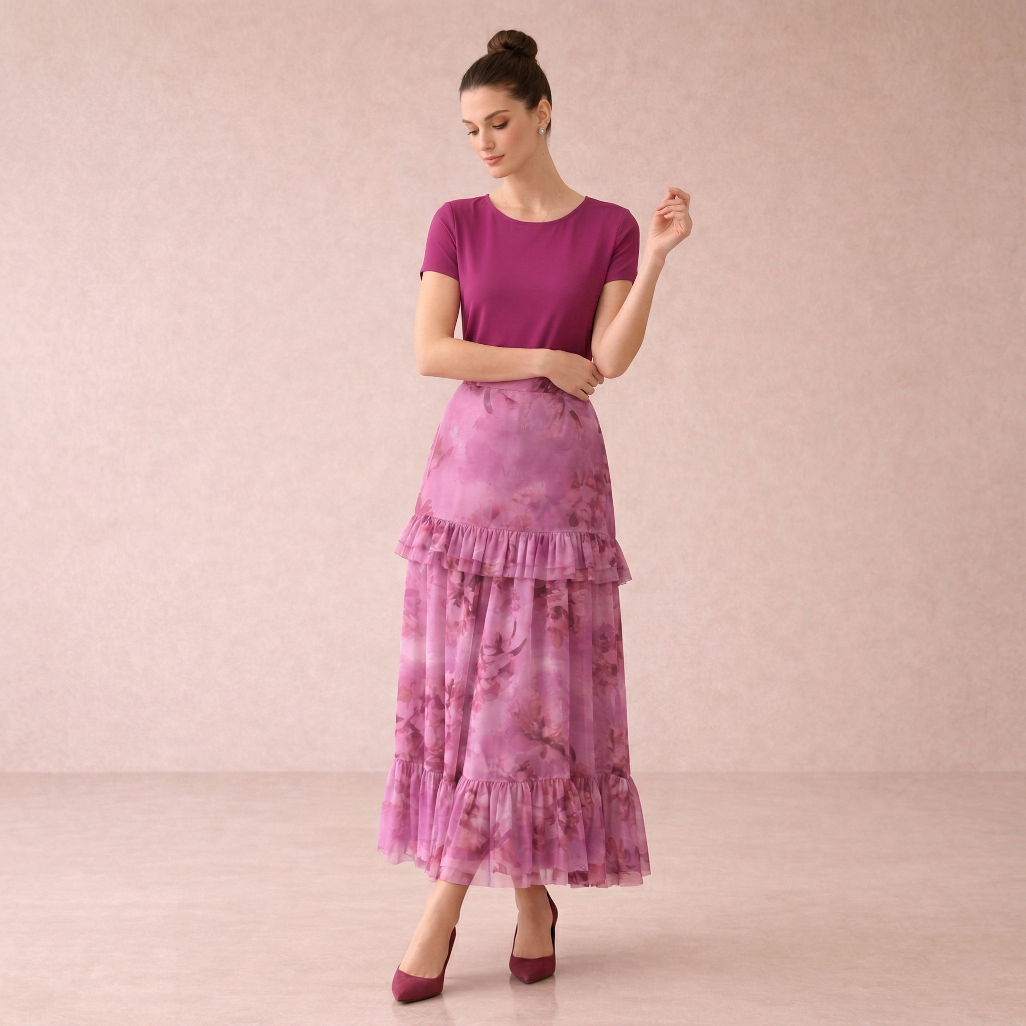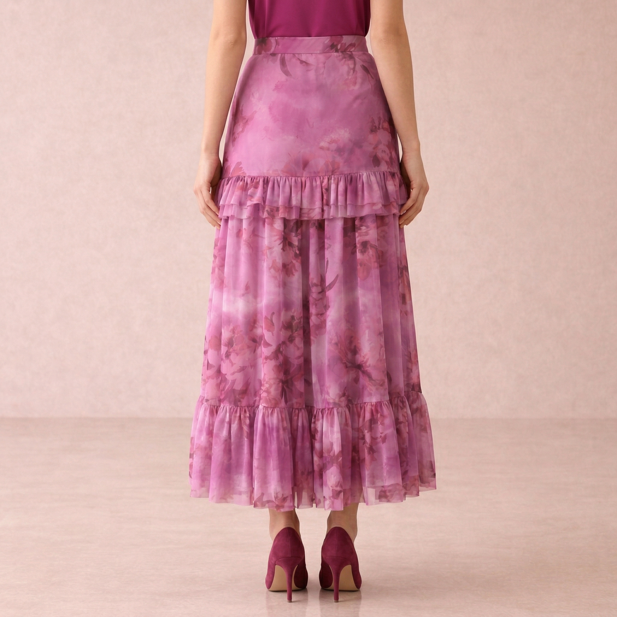 A soft and feminine maxi skirt featuring a delicate floral print with layered ruffle tiers. Perfect for a elegant everyday or occasion wear.