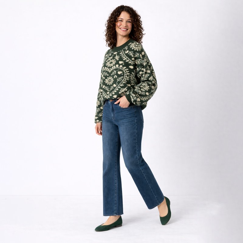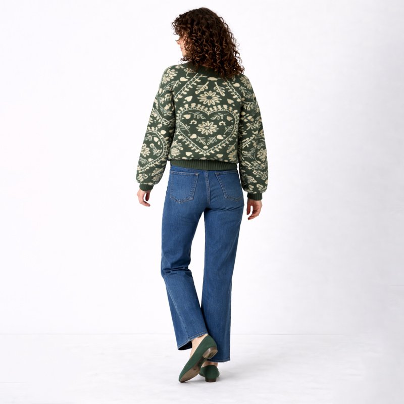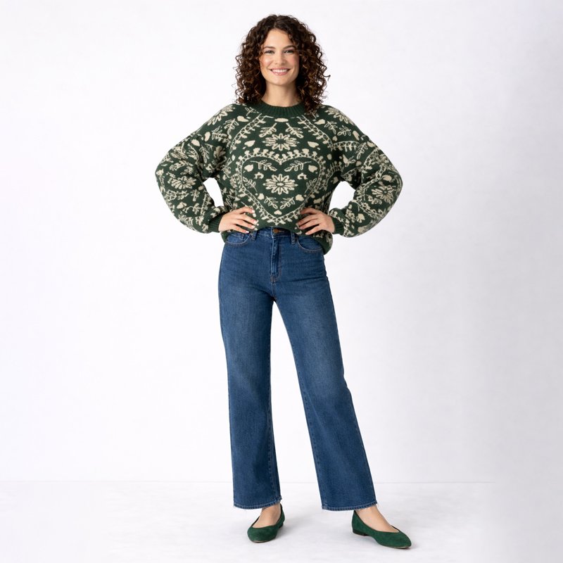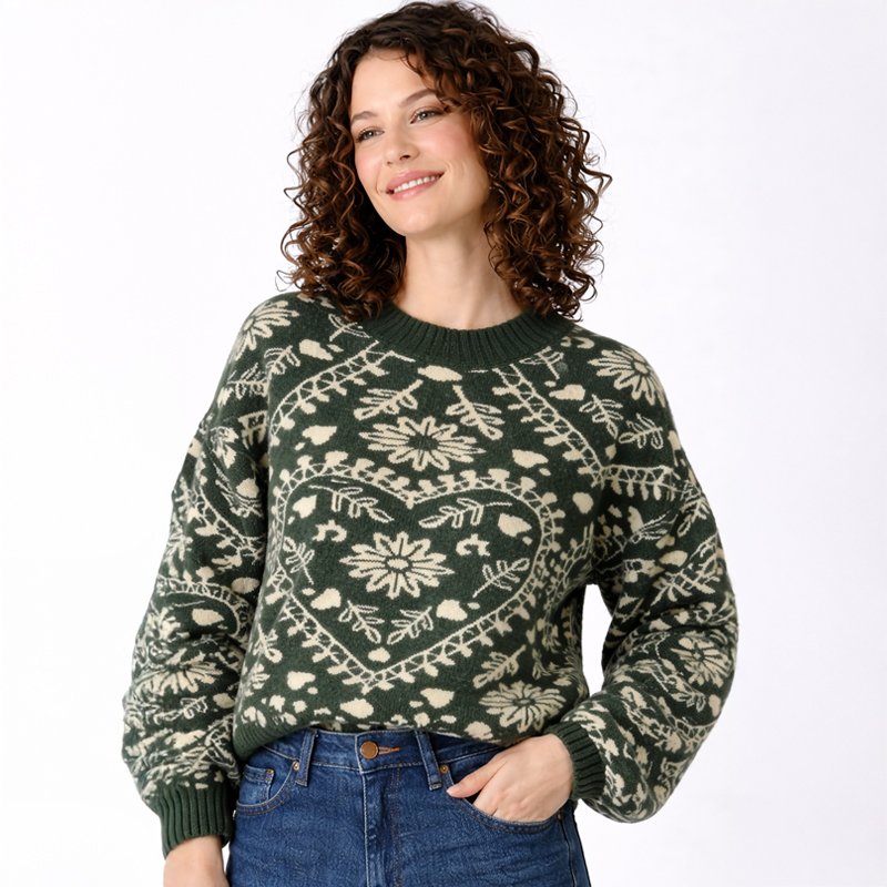 A cozy forest green knit sweater featuring an intricate floral and heart pattern throughout. Soft, warm, and effortlessly stylish, perfect for everyday wear with a modest yet modern feel.