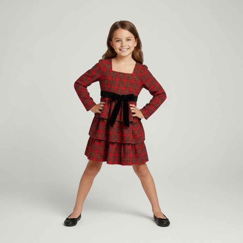 A classic red plaid tiered dress with a velvet waist tie for a festive, refined look. Pair it with black flats, a soft headband, or a warm cardigan for Christmas gatherings and family celebrations.-