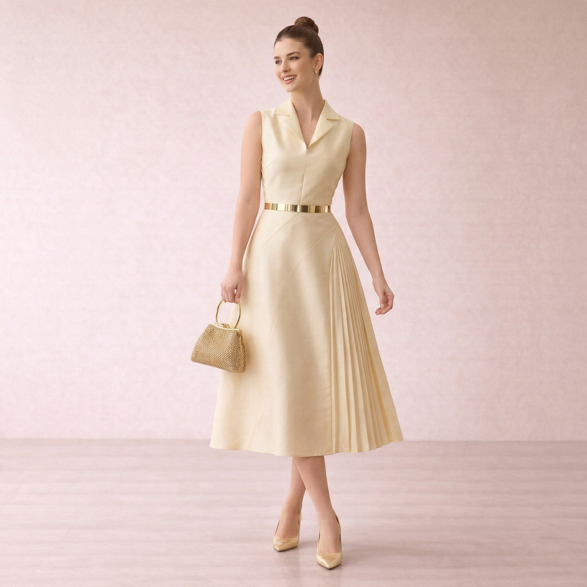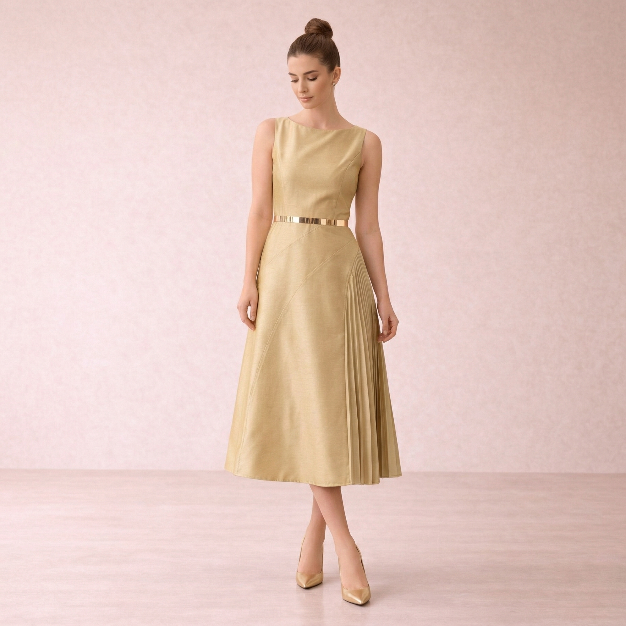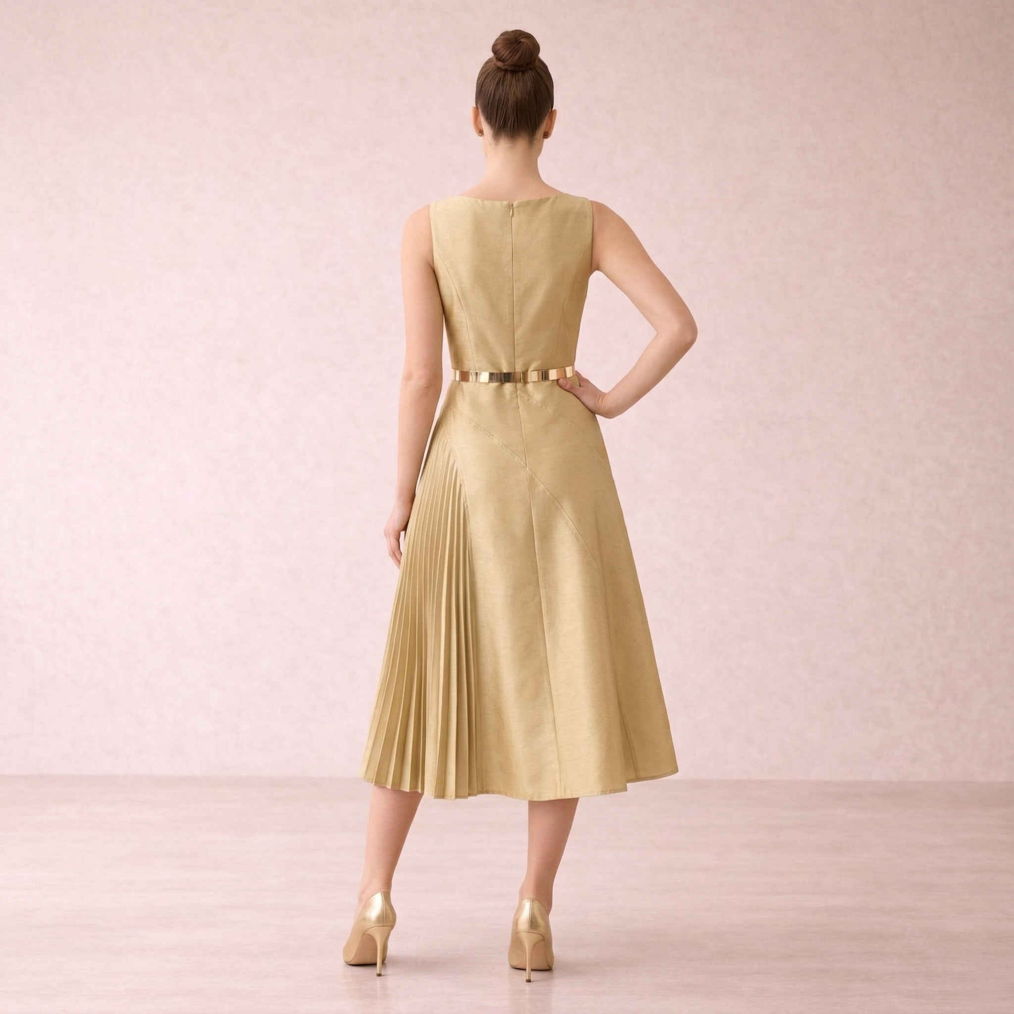 Gold Pleated Panel Midi Dress