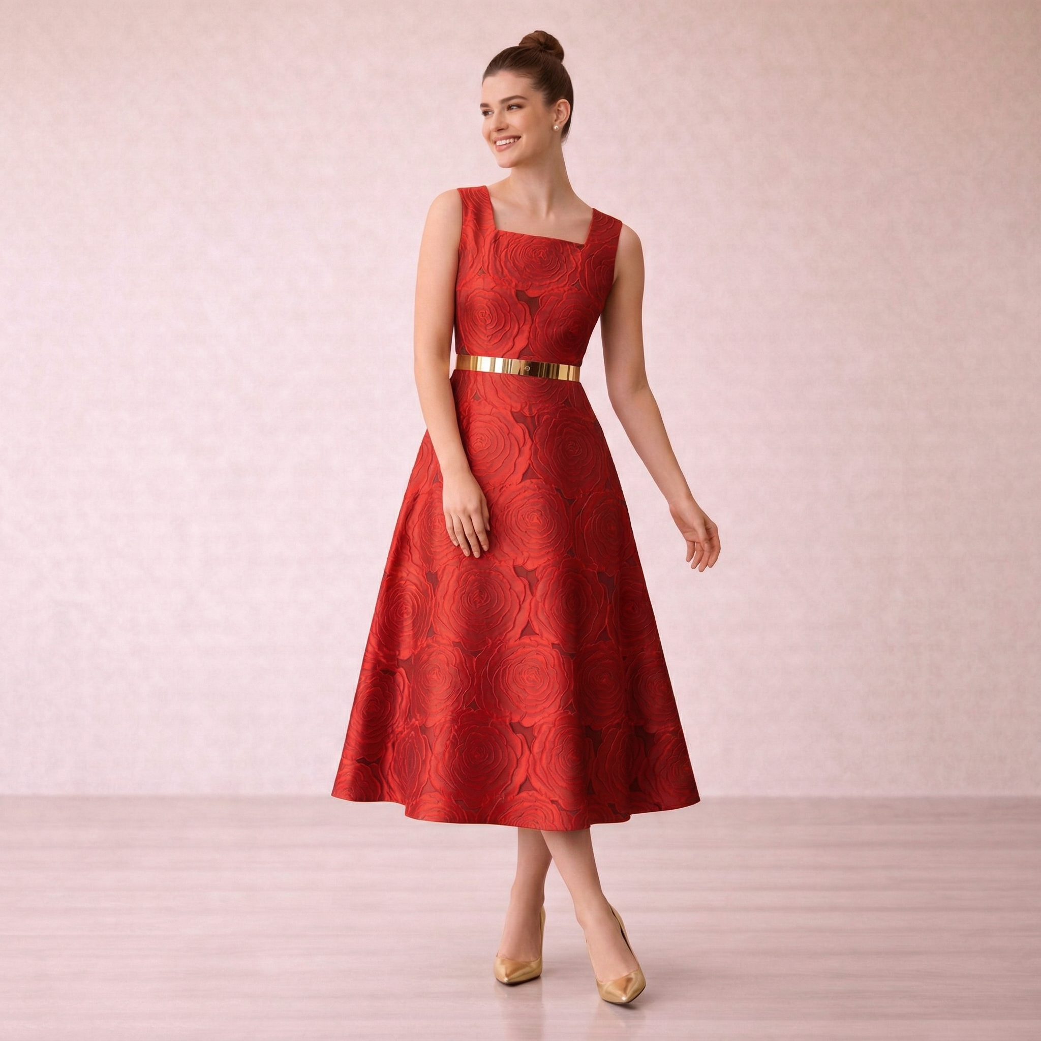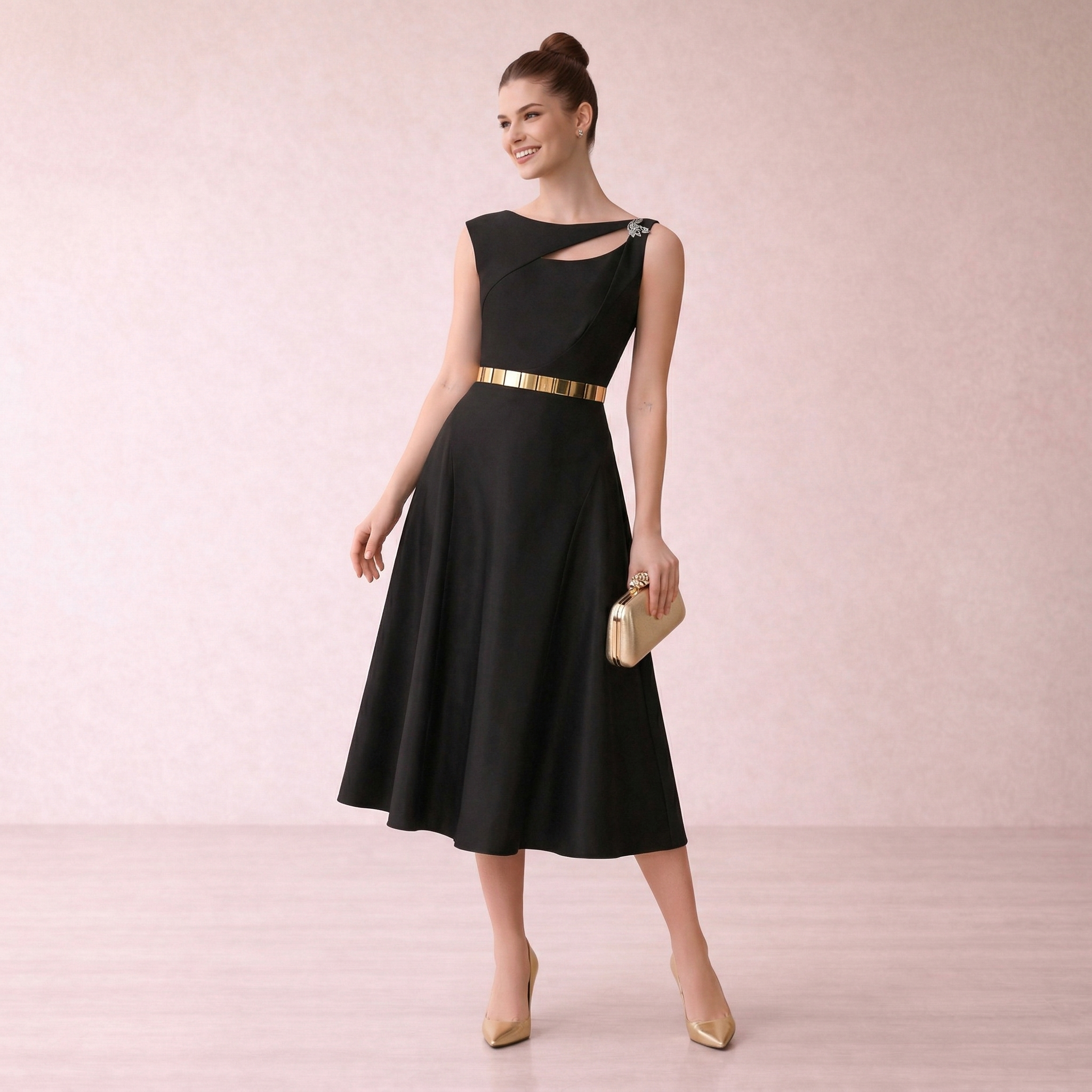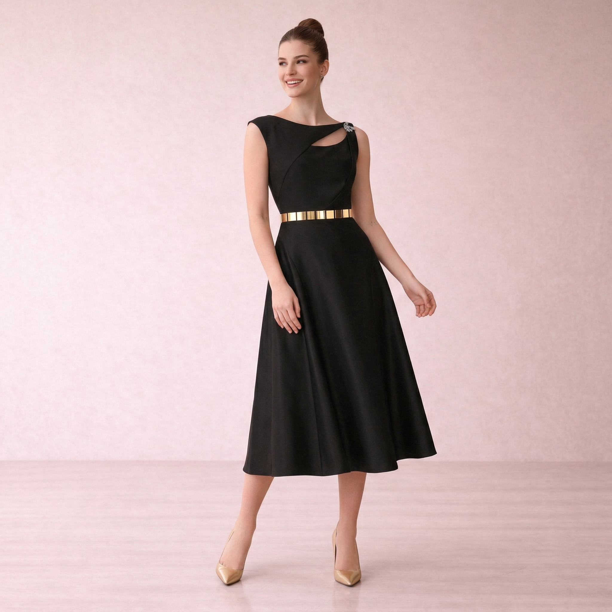 An elegant midi dress in a luxe gold tone, featuring a sleek silhouette with a statement pleated panel. Perfect for formal occasions and evening events.