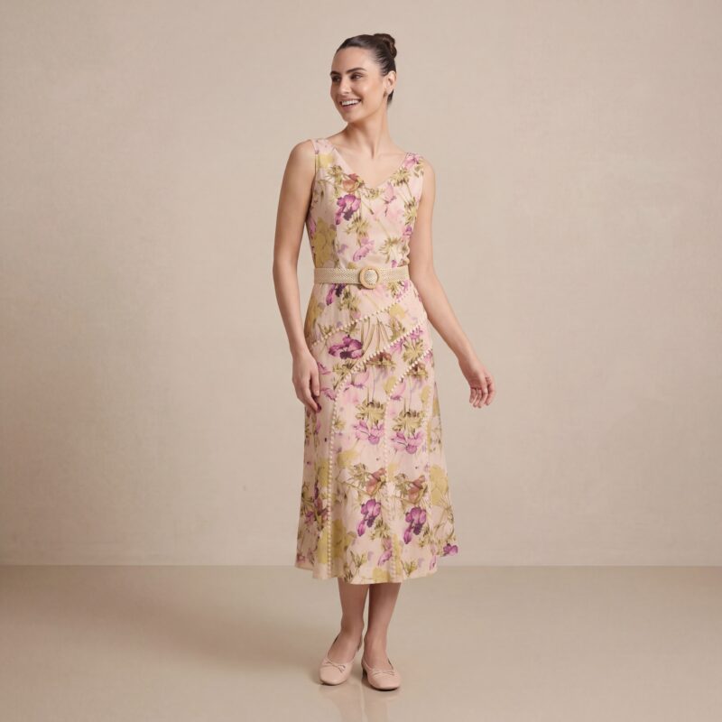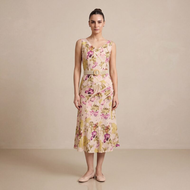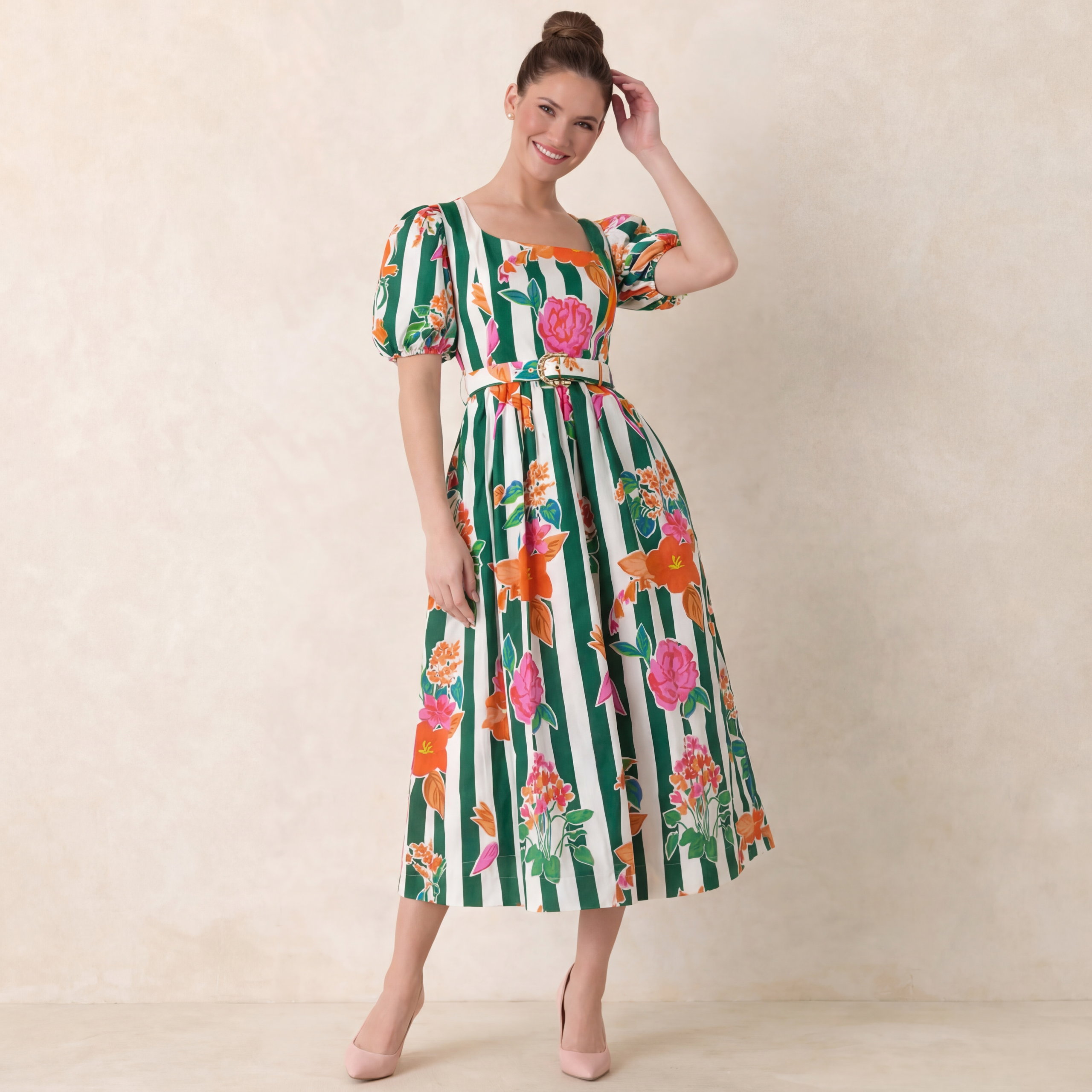 Brighten your wardrobe with this eye-catching midi dress designed with a flattering fitted waist and statement belt. Perfect for daytime events, holidays, or summer occasions.