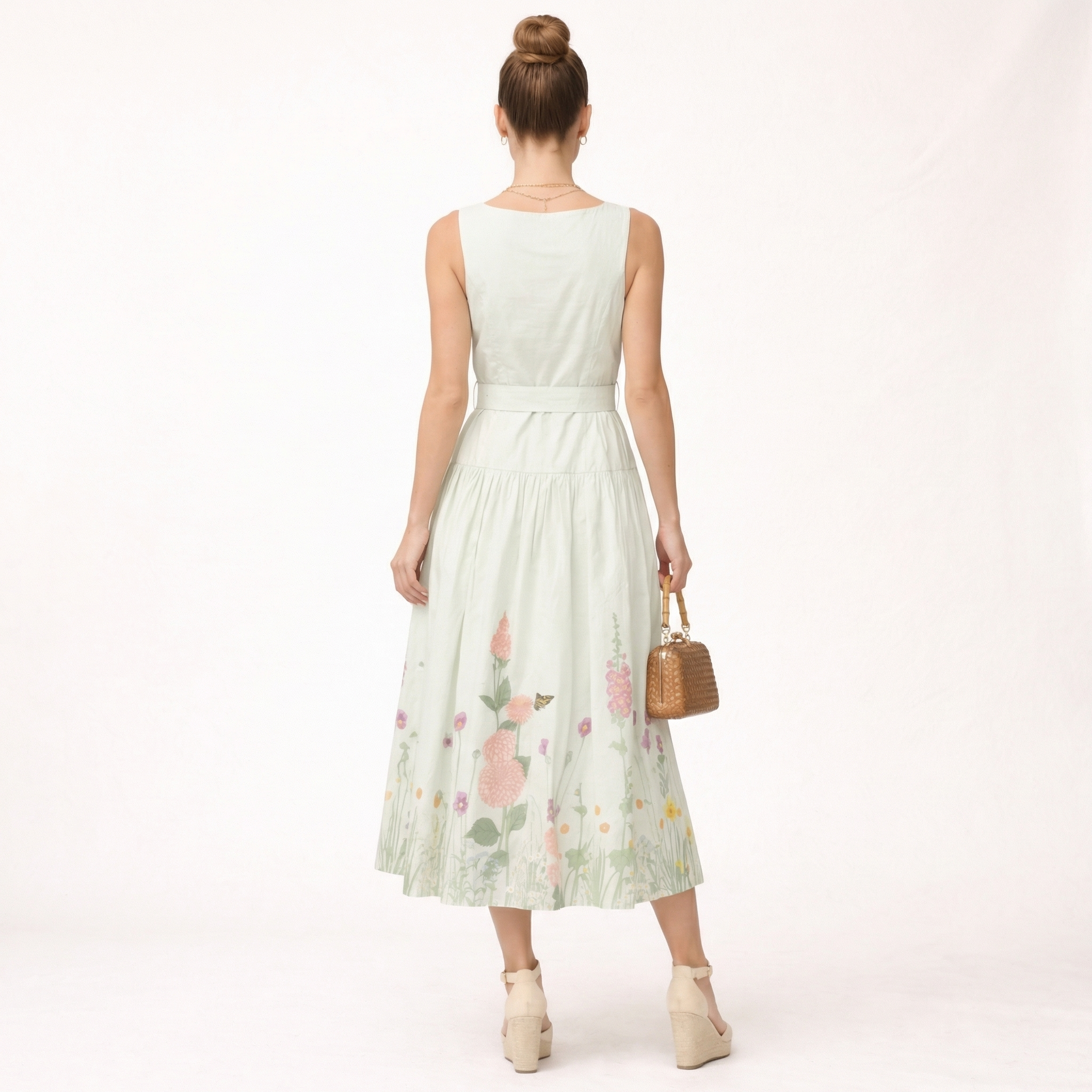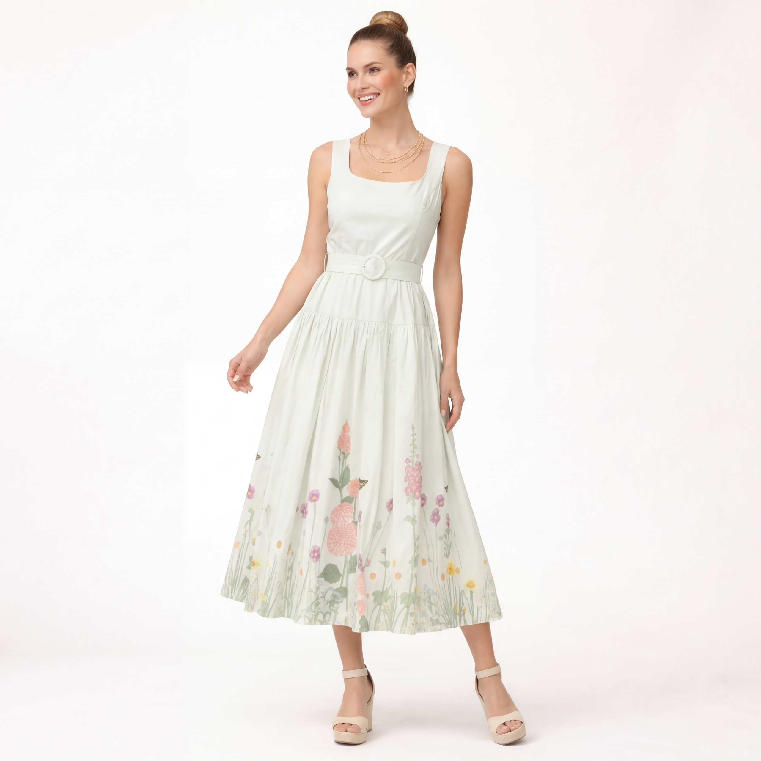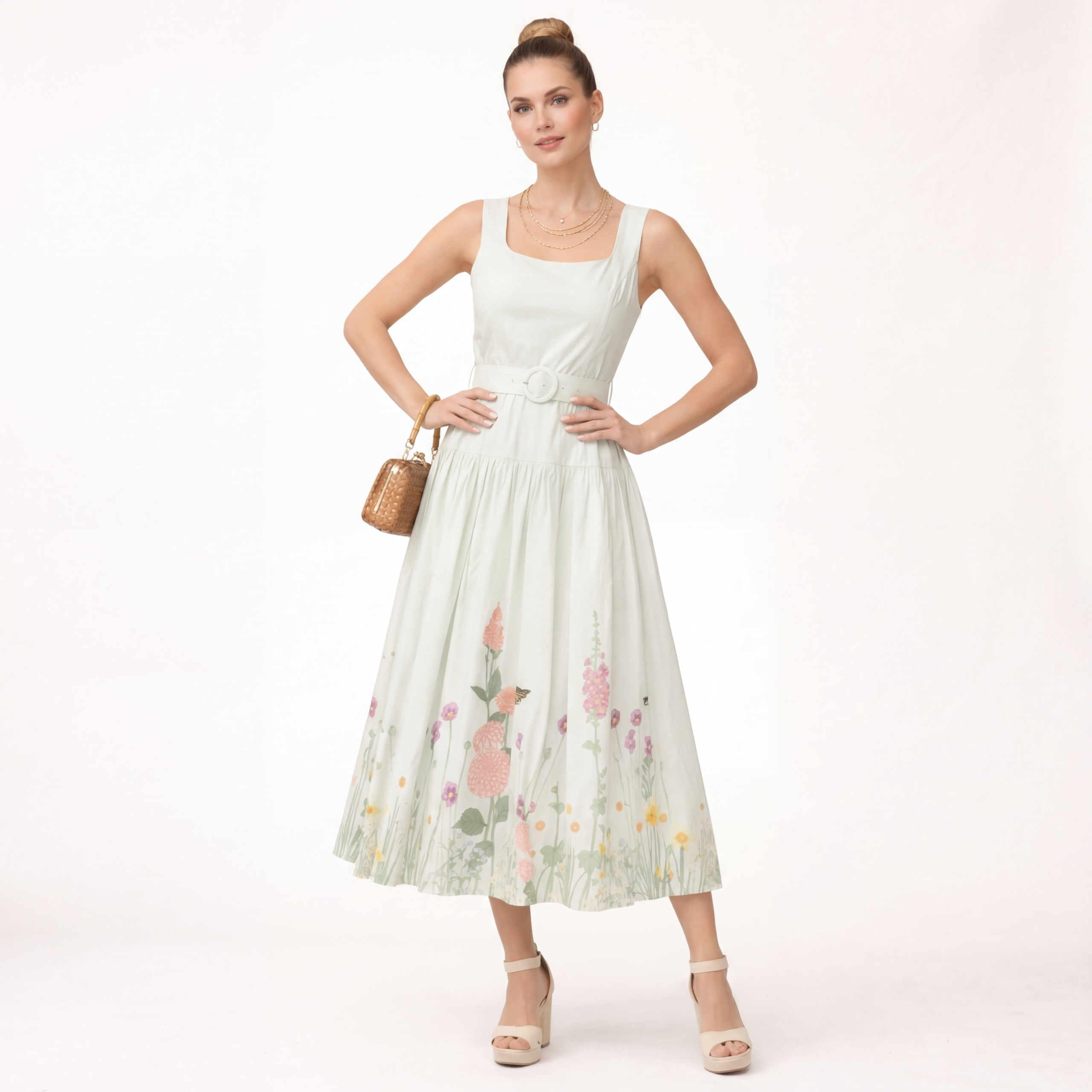 A soft and elegant midi dress designed with a flattering belted waist and tiered skirt for a graceful, feminine look. Perfect for daytime occasions and summer outings.