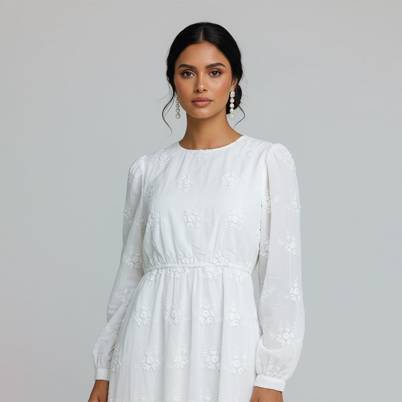 A classic white maxi dress with delicate embroidery, long sleeves, and hidden side pockets. Perfect for church, events, or everyday elegance.