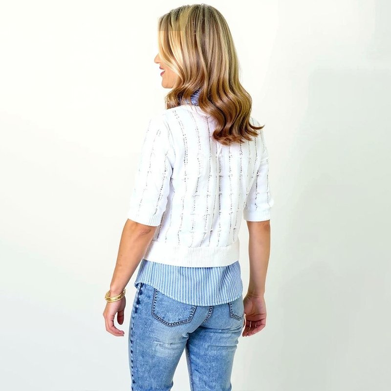 Two-in-one layered design: cable-knit sweater over striped shirt