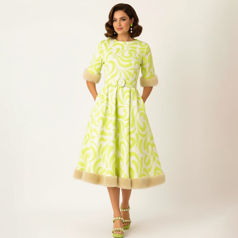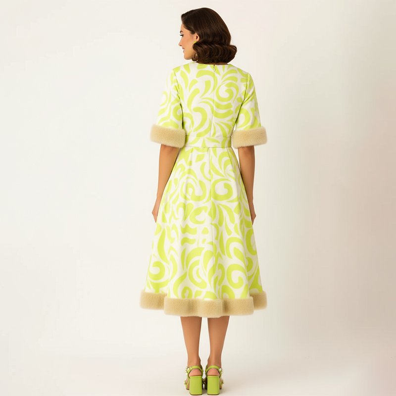 Step into confidence with this lime green patterned midi dress, designed with faux fur trim and a flattering belted waist.-