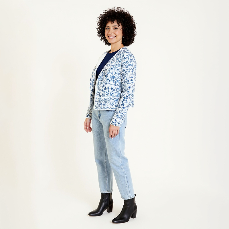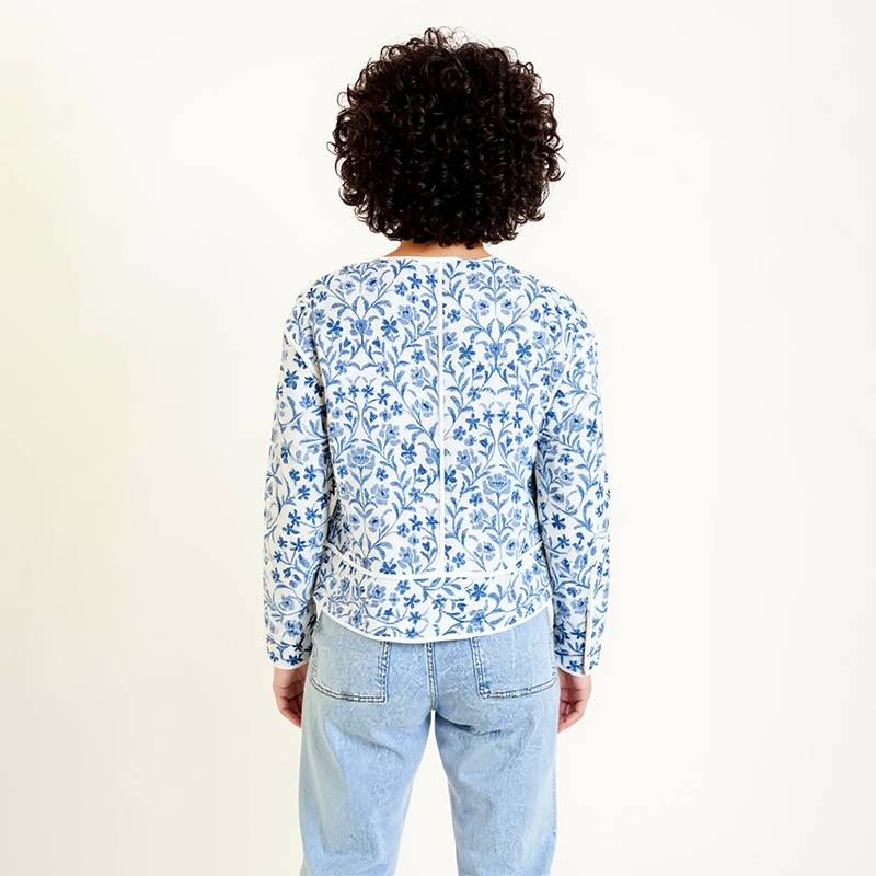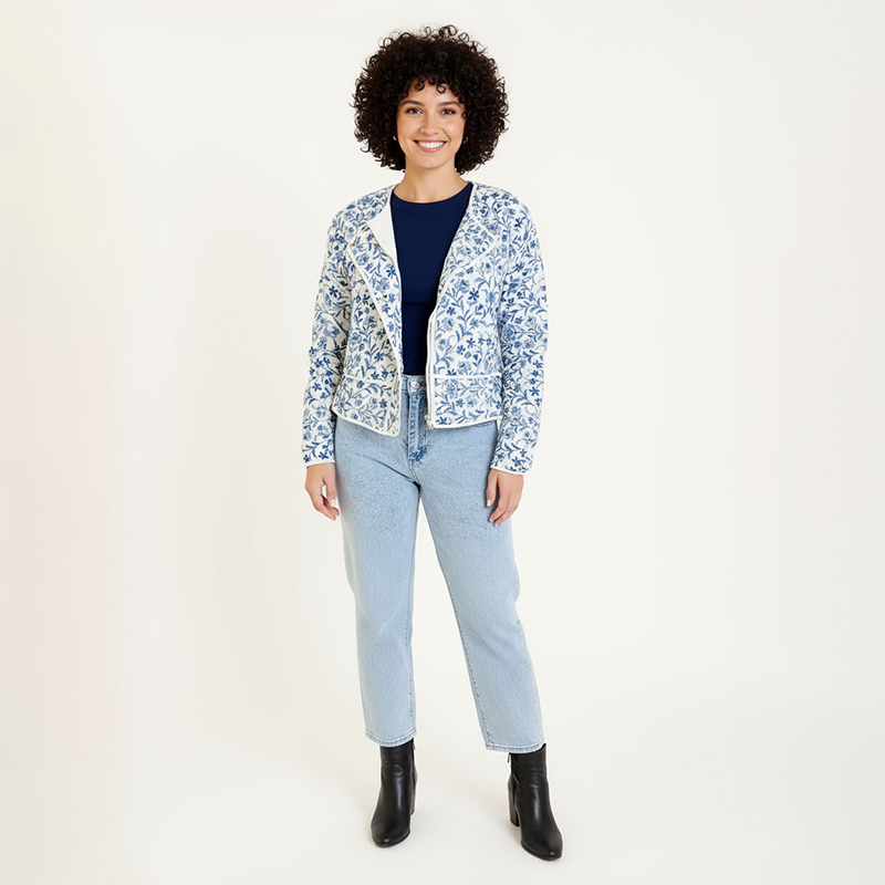 Crisp and elegant, this ivory jacket with blue embroidery adds a touch of sophistication. Style with light denim, white sneakers, and silver jewelry for a polished casual outfit.- Quilted construction