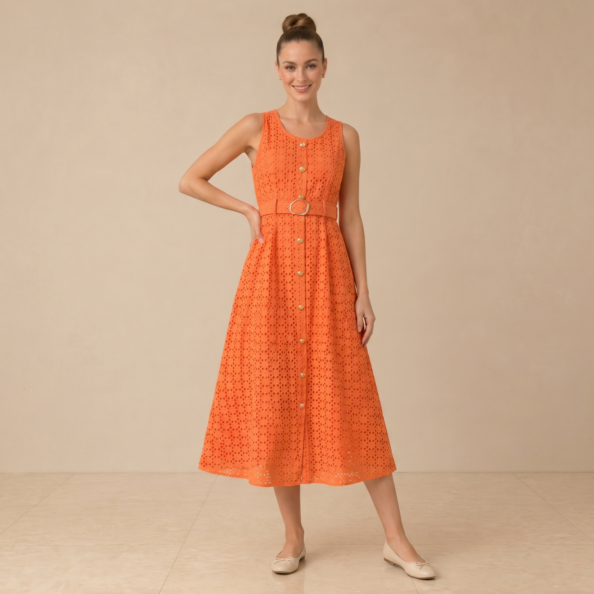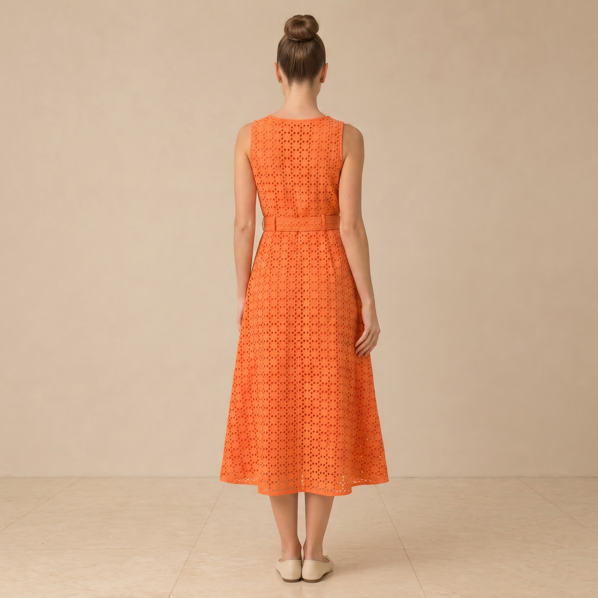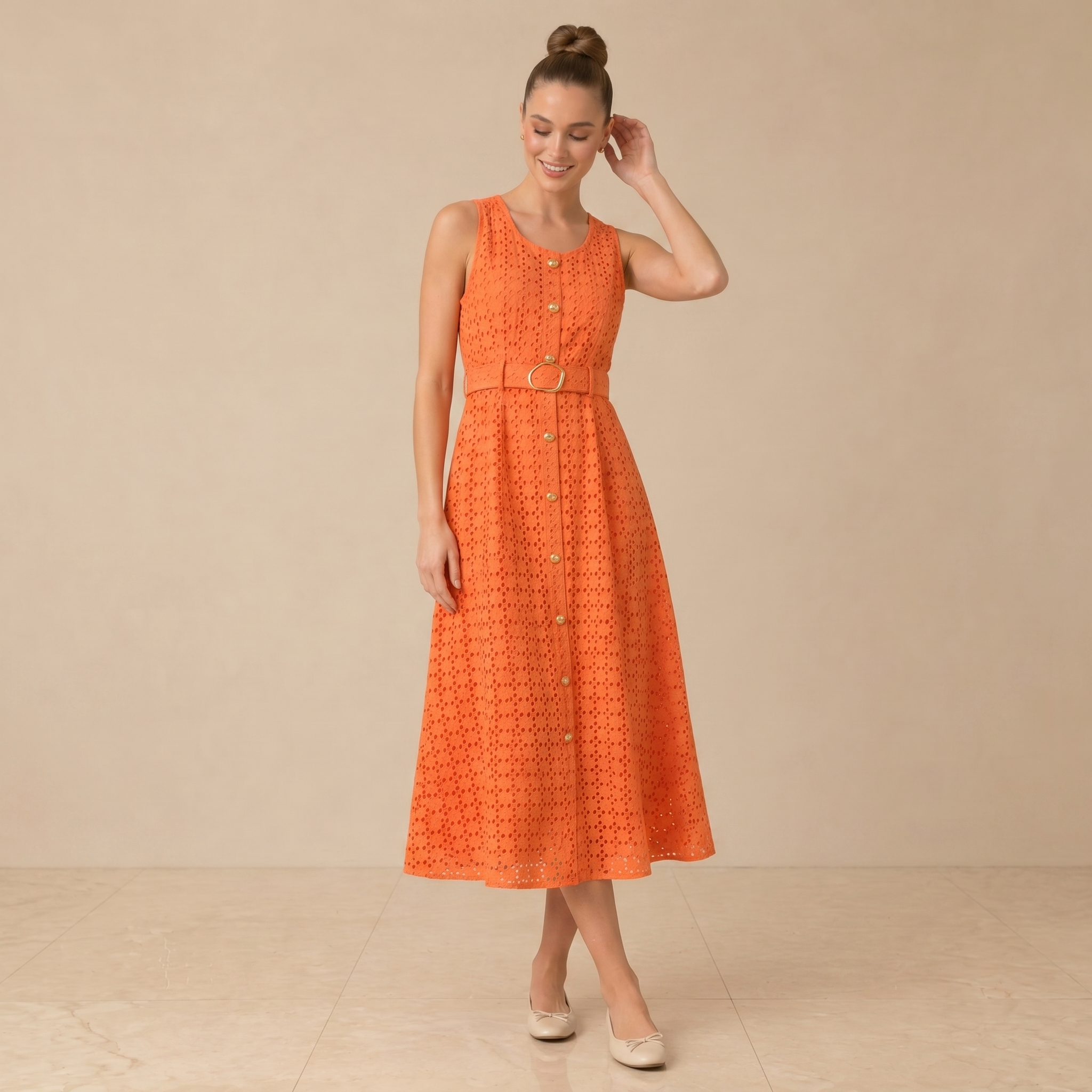 Add a pop of color to your wardrobe with this orange broderie midi dress. It’s perfect for summer days, holidays, and casual outings.
