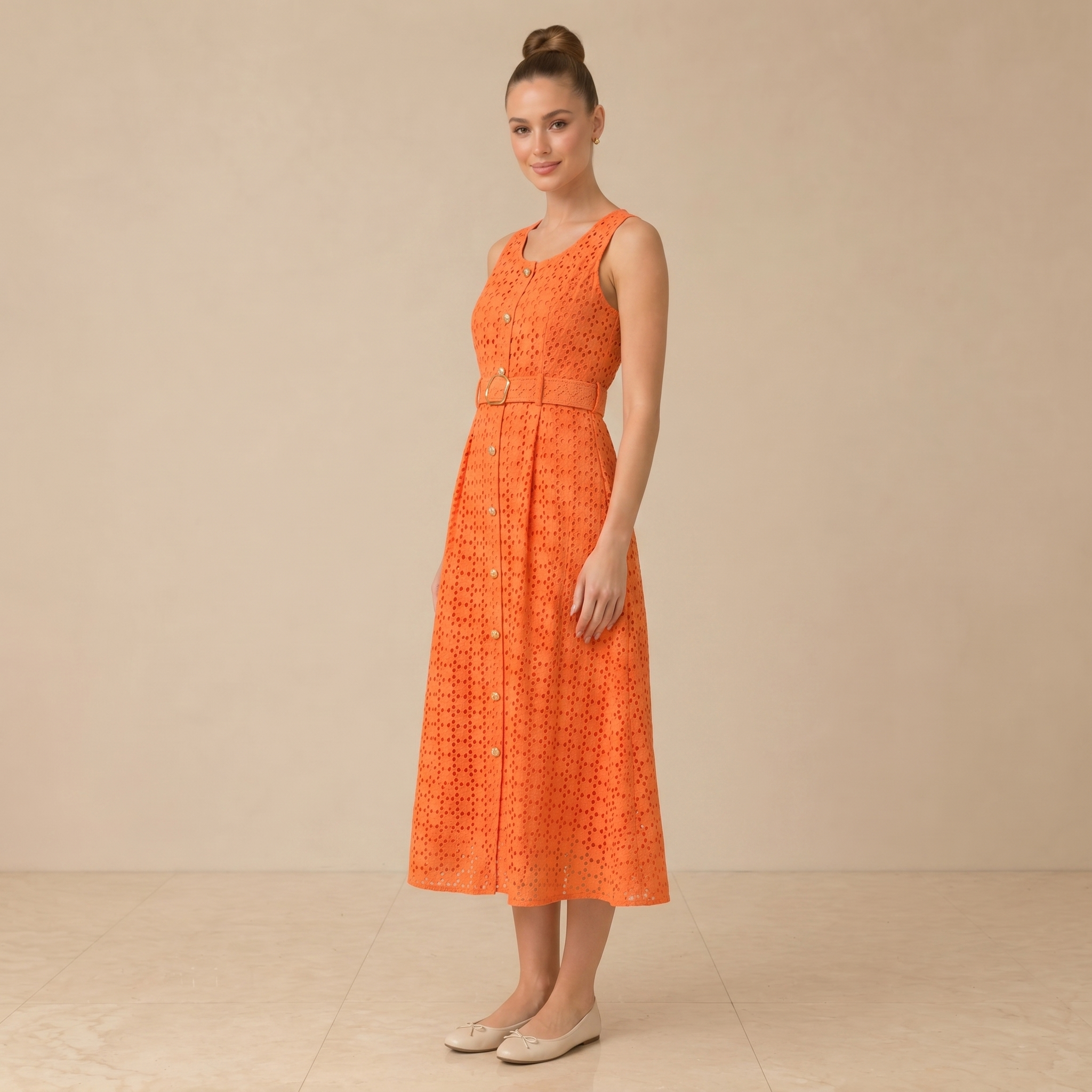 Orange Broderie Belted Midi Dress Orange Broderie Belted Midi Dress
