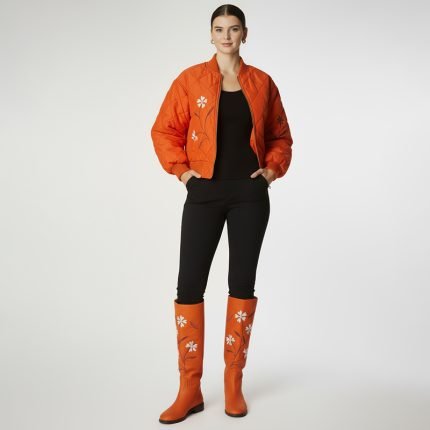 Stand out in bold style with this orange quilted bomber jacket, detailed with delicate floral embroidery. A perfect balance of statement color and feminine charm for everyday wear.-