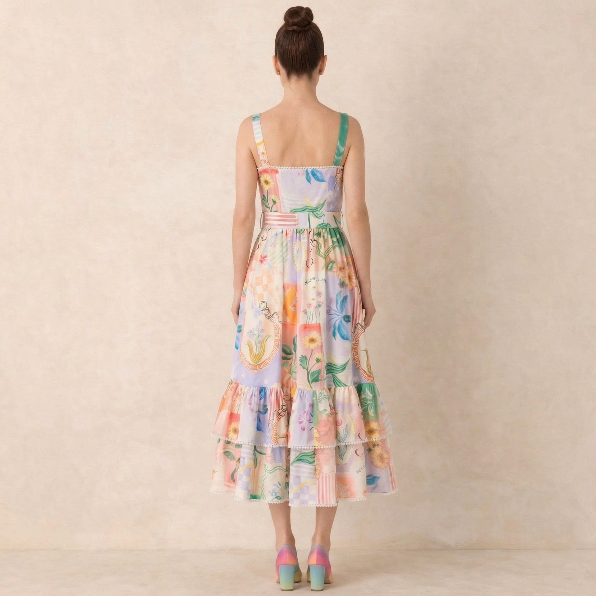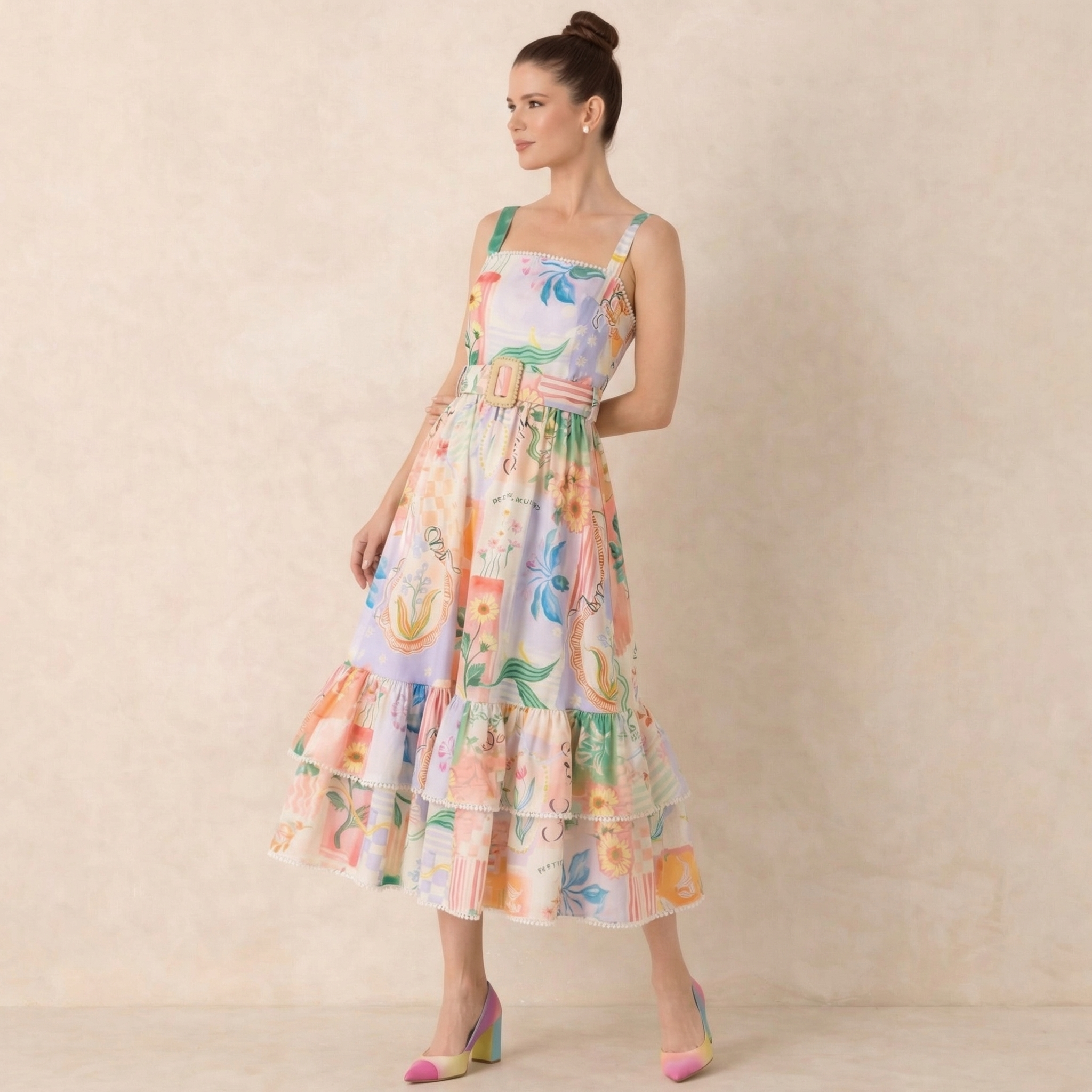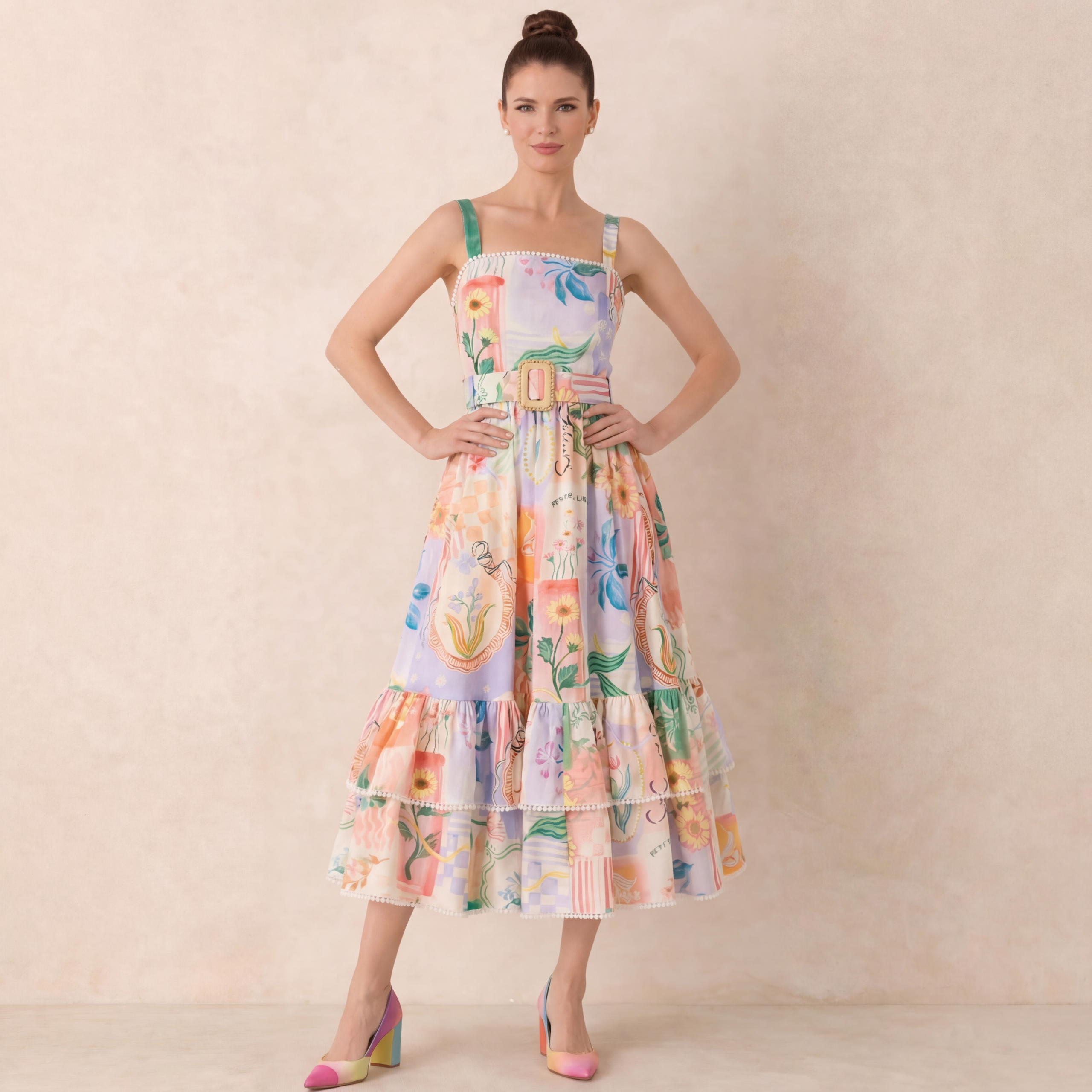 Playful pastel print midi dress with a flattering belted waist. Perfect for brunch, vacations, or summer days.