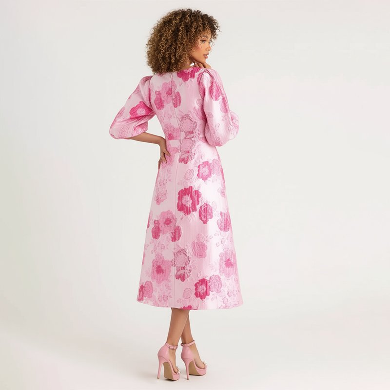 Make every occasion unforgettable in this pink floral jacquard midi dress designed for timeless elegance and effortless charm.-