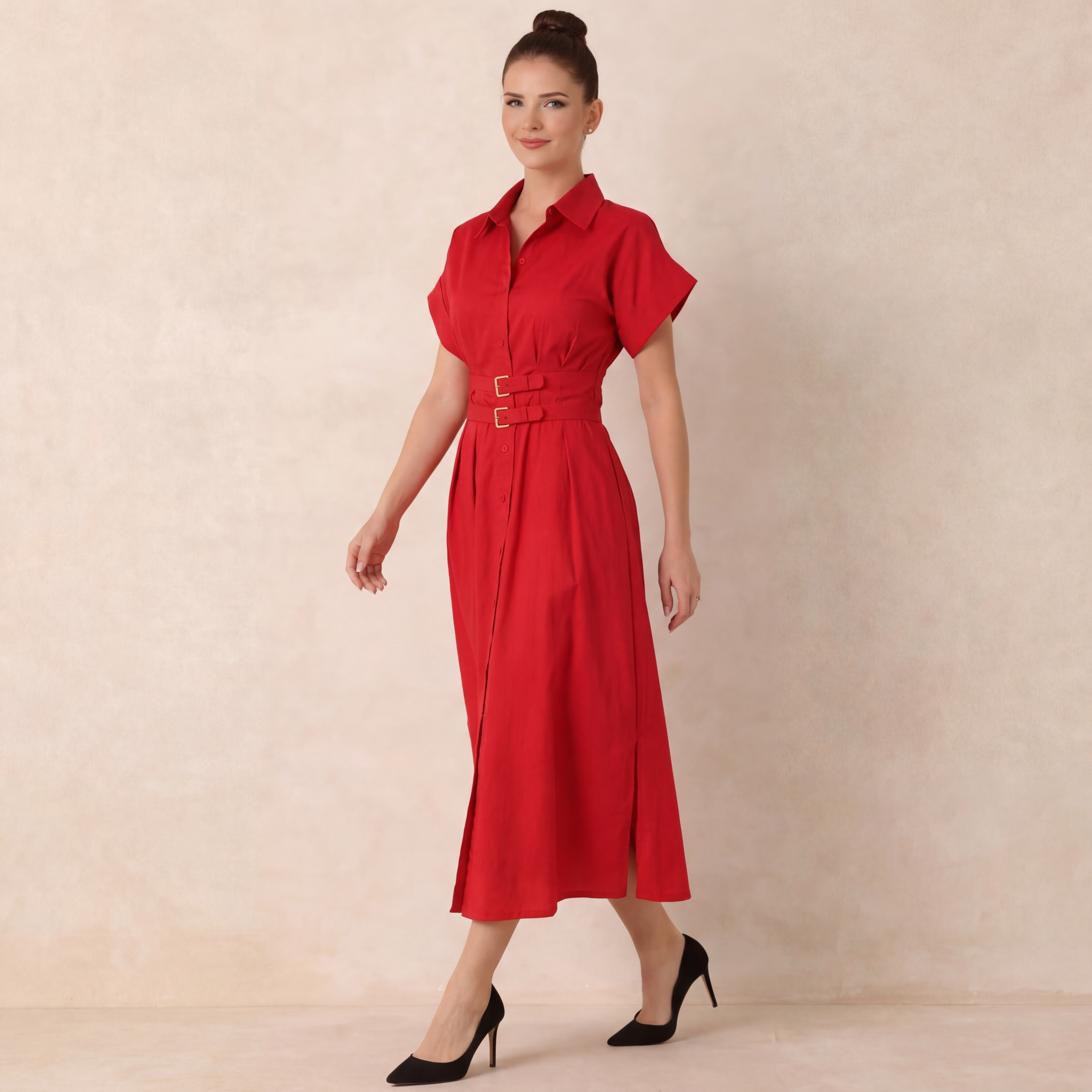 Chic red shirt midi dress with a flattering double-belt waist. Perfect for work, outings, or everyday style.