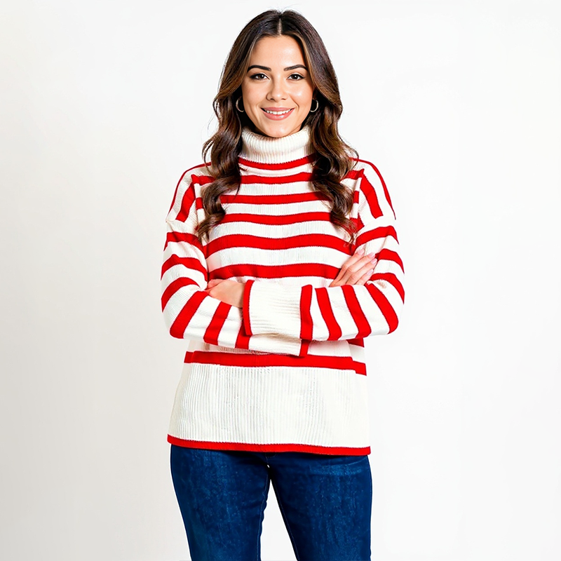 This cozy red and white striped knit turtleneck adds a festive touch to your winter wardrobe. Whether you're decorating with the kids, sipping cocoa on the porch, or heading to a casual gathering, this one keeps you feeling warm and stylish. Pair it with denim, boots, and a cheerful heart.