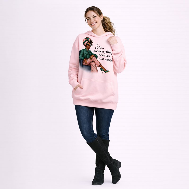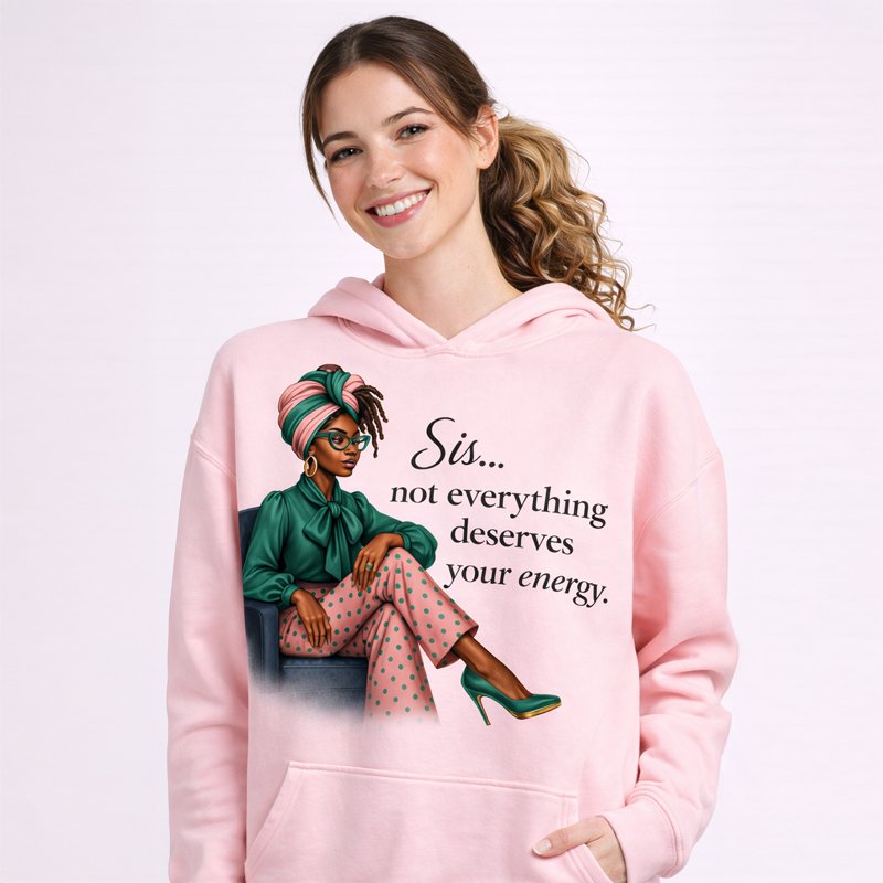 A soft and cozy hoodie in a blush pink tone, featuring a stylish illustrated graphic with an empowering reminder to protect your peace. Designed with a relaxed fit, classic hood, and front pocket for everyday comfort.