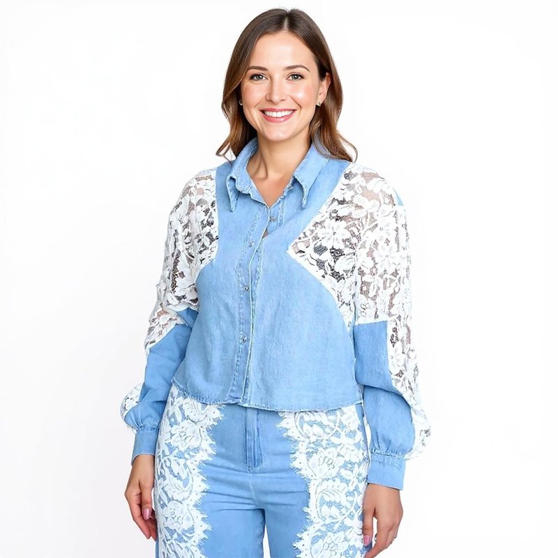 lip into this sky-blue denim shirt for an instantly fresh vibe. Perfect for brunches, city strolls, or casual Fridays, it’s a stylish twist on a classic denim top with eye-catching lace detail that elevates your look wherever you go.-