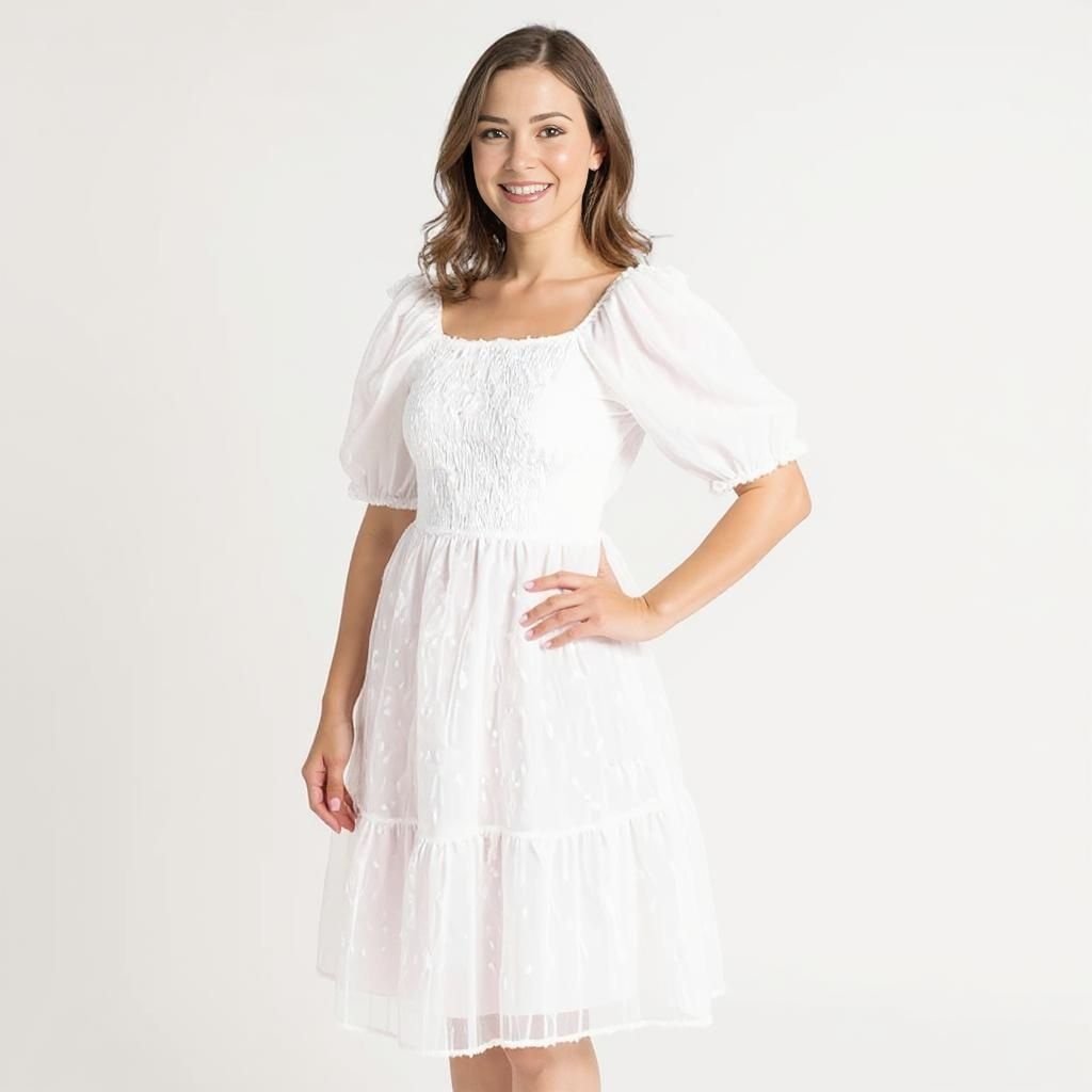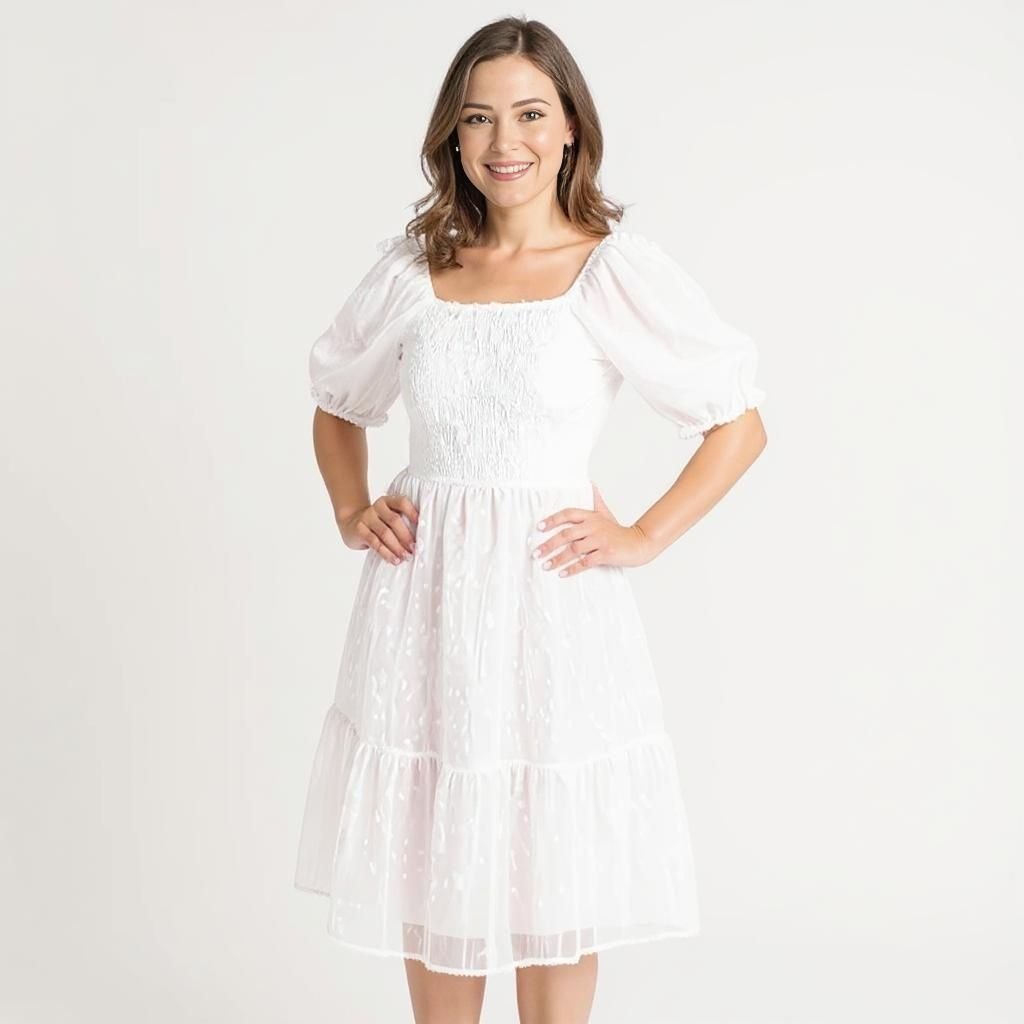 Perfect for worship services, bridal showers, or family celebrations, this dress blends delicate sheer layers and graceful puff sleeves to bring gentle sophistication and comfort to every special day.- Model is 5'6" wearing size M. You can select your height before purchase for the perfect fit.