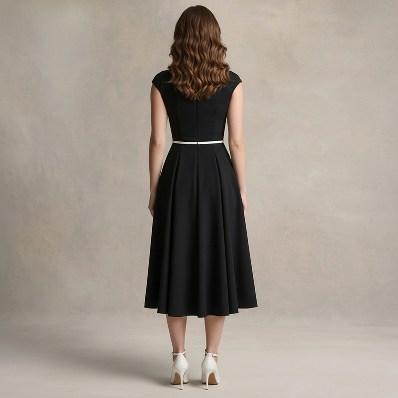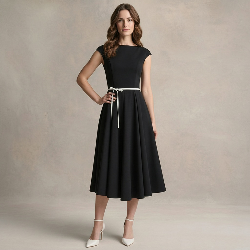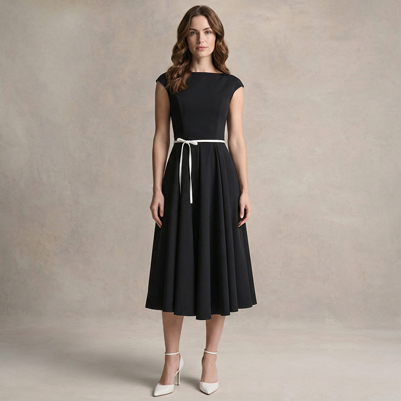 A classic black midi dress with a clean silhouette and waist tie detail. Perfect for both casual and formal occasions.