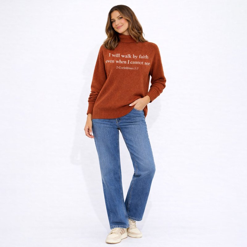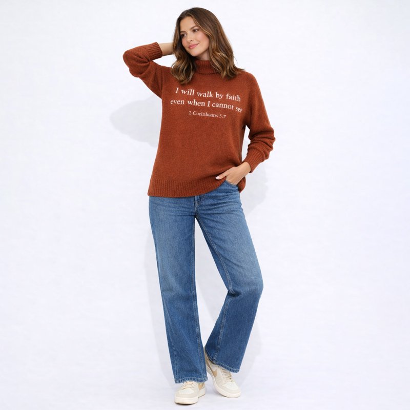 A warm and meaningful knit sweater featuring an inspiring faith-based message across the front. Designed for comfort and everyday wear, this cozy piece blends timeless style with a heartfelt statement, making it perfect for casual outings or relaxed days with purpose.