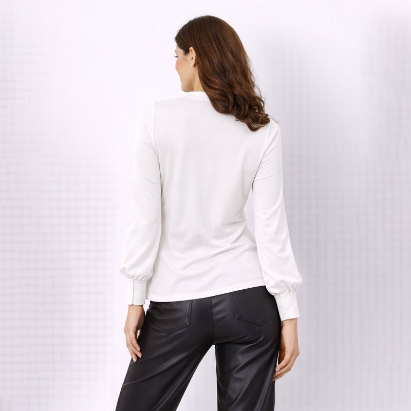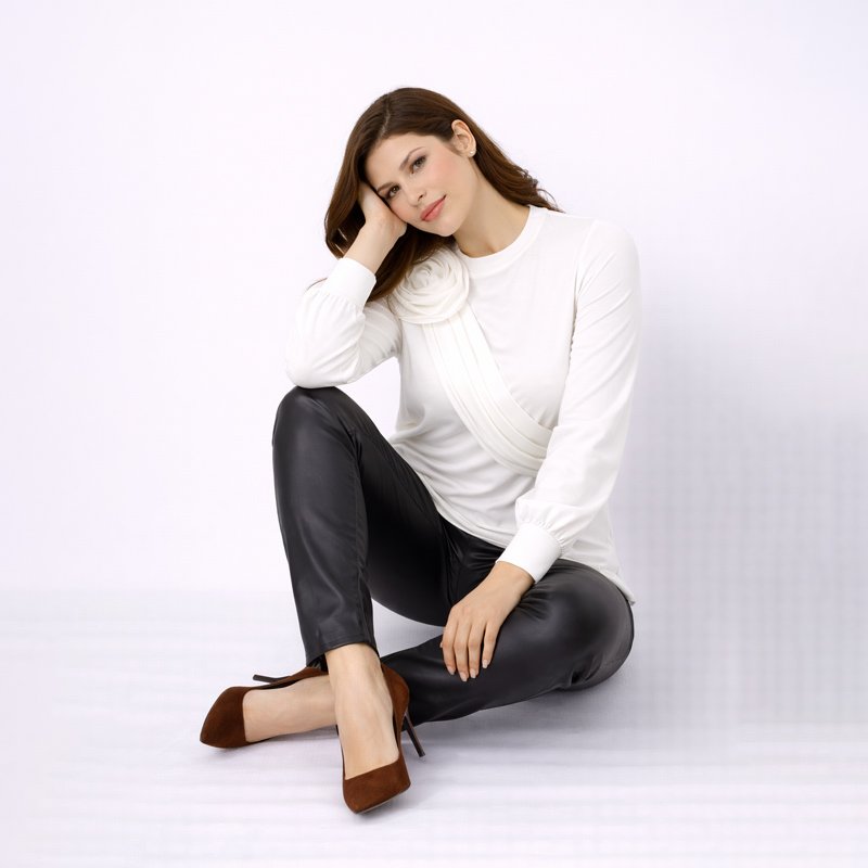 A refined and sophisticated long-sleeve top designed in a crisp white hue, featuring a soft rosette accent with graceful draped detailing across the front for a timeless, feminine look.