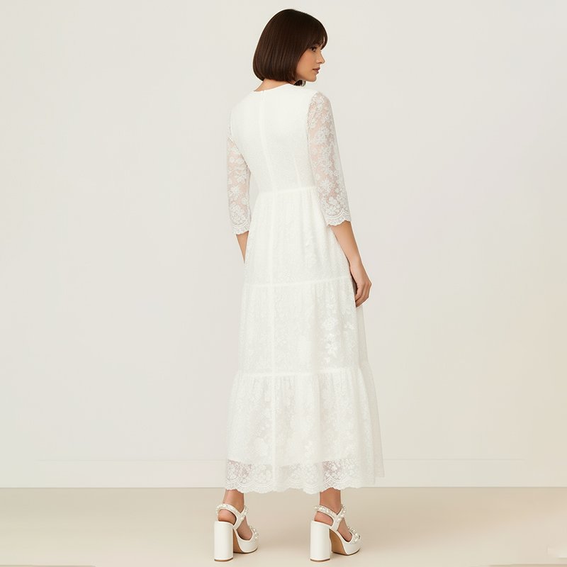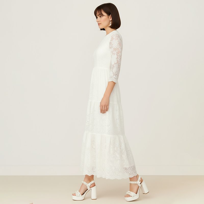 This white lace sleeve maxi dress is chic and modest with a graceful flow. Pair with pearl drop earrings, a nude clutch, and white or silver heels. Style hair in a soft bun or loose waves for an elegant finish.