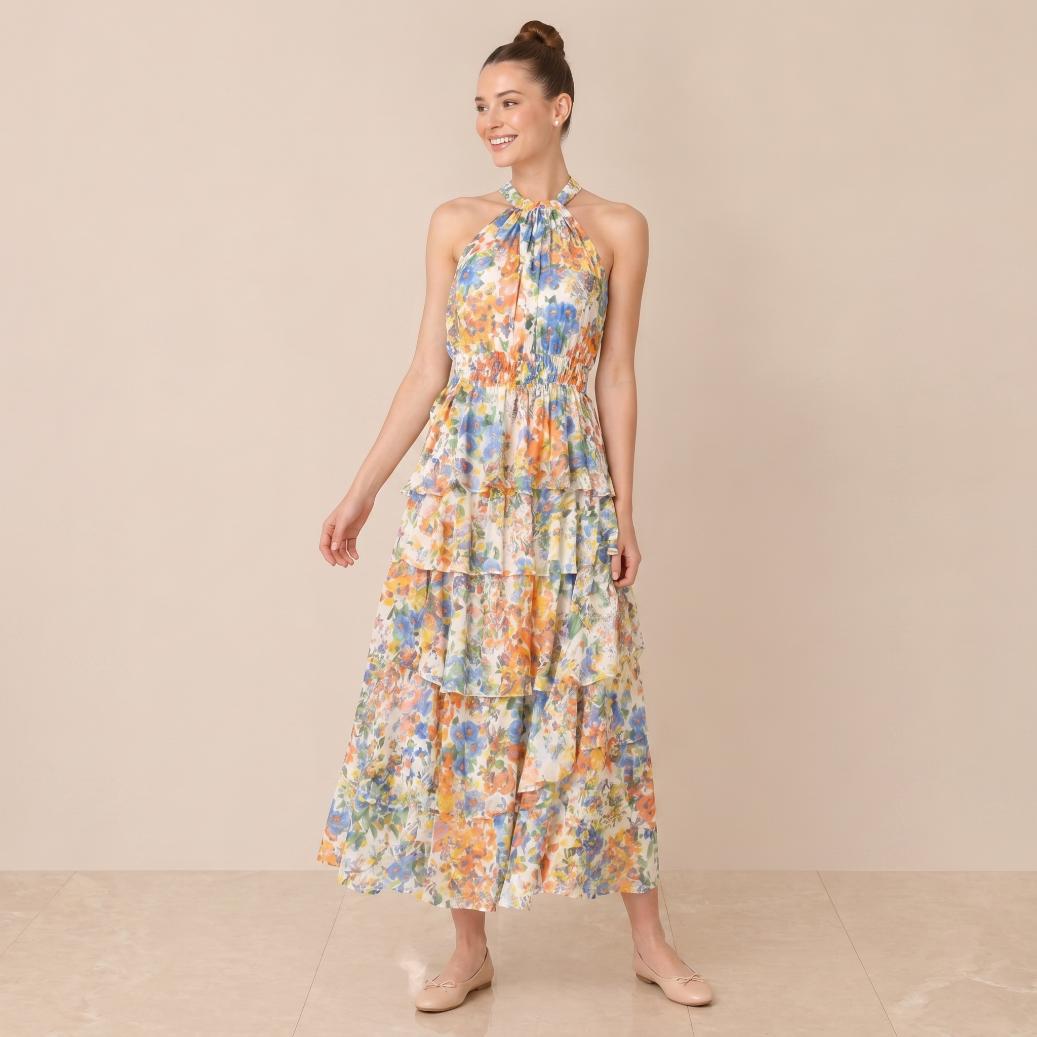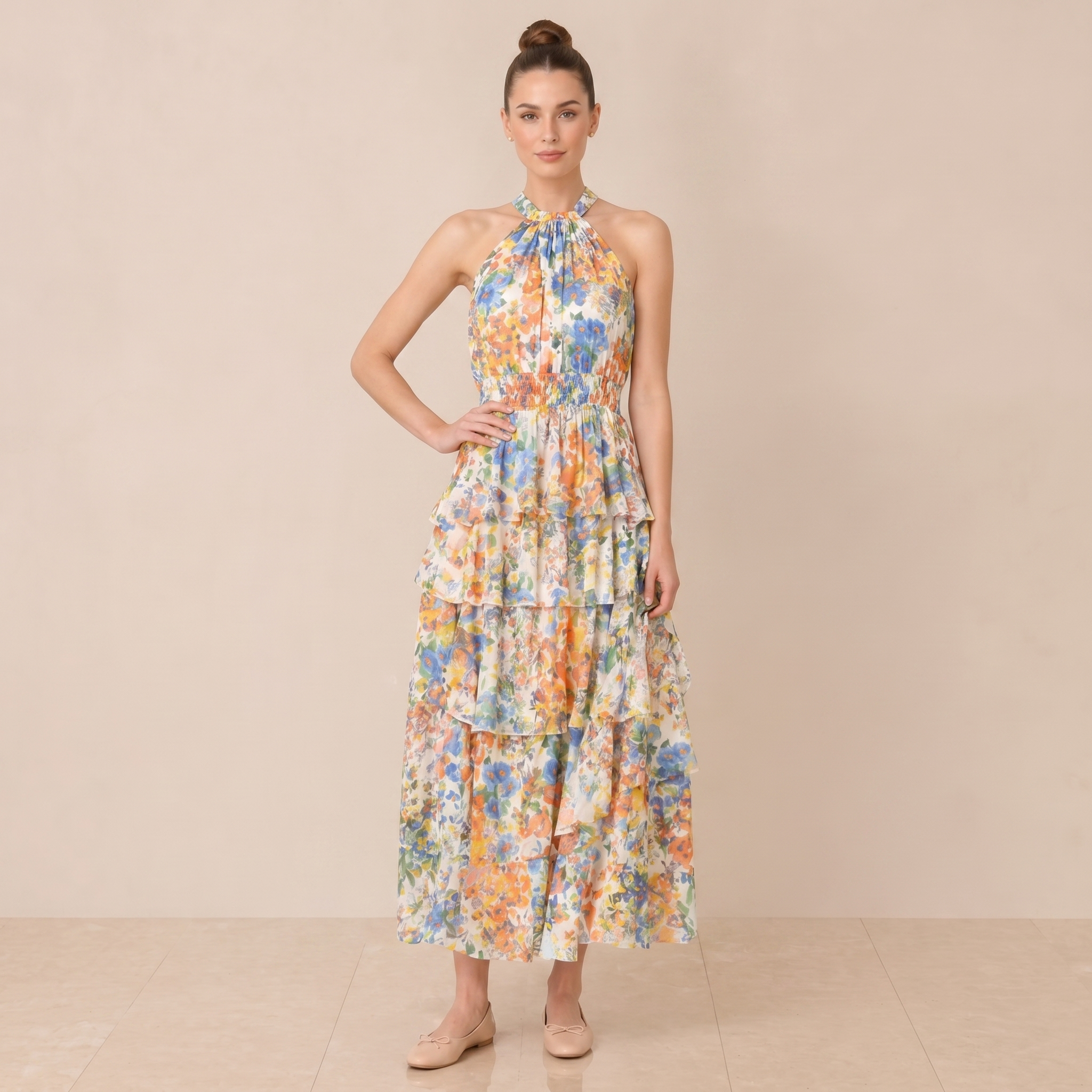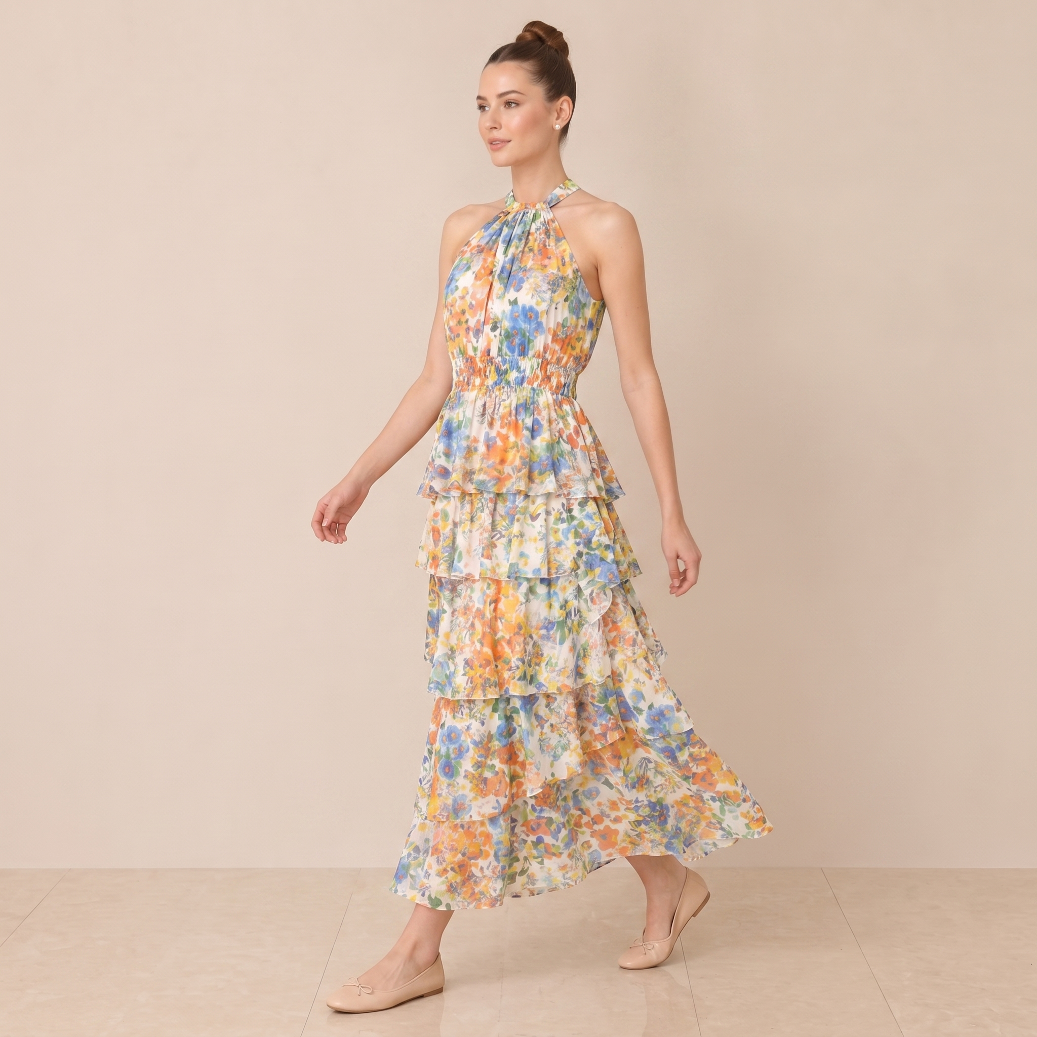 Flowy floral maxi dress with a halter neckline and tiered ruffle layers for a fresh, feminine look. Perfect for elegant daytime or spring occasions.