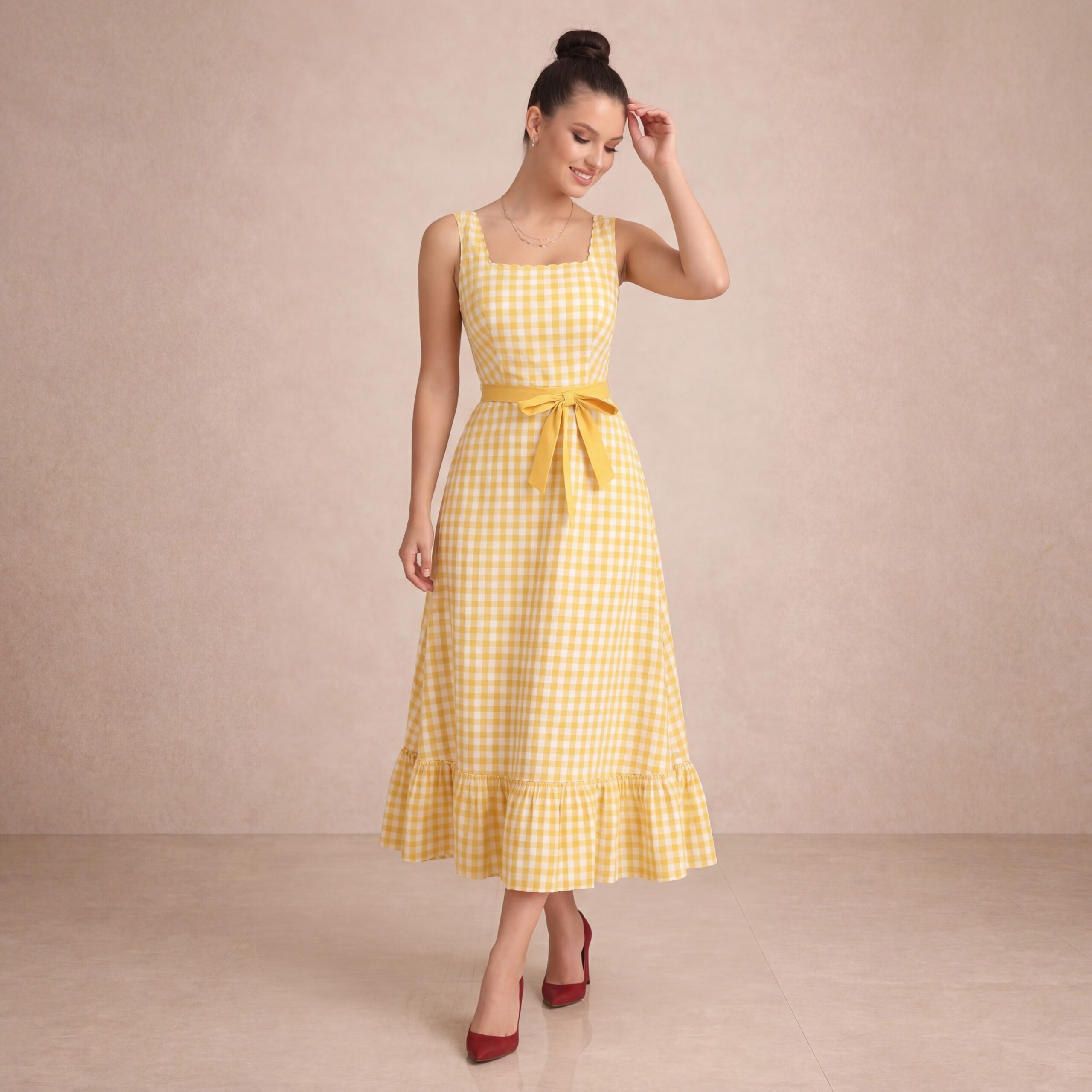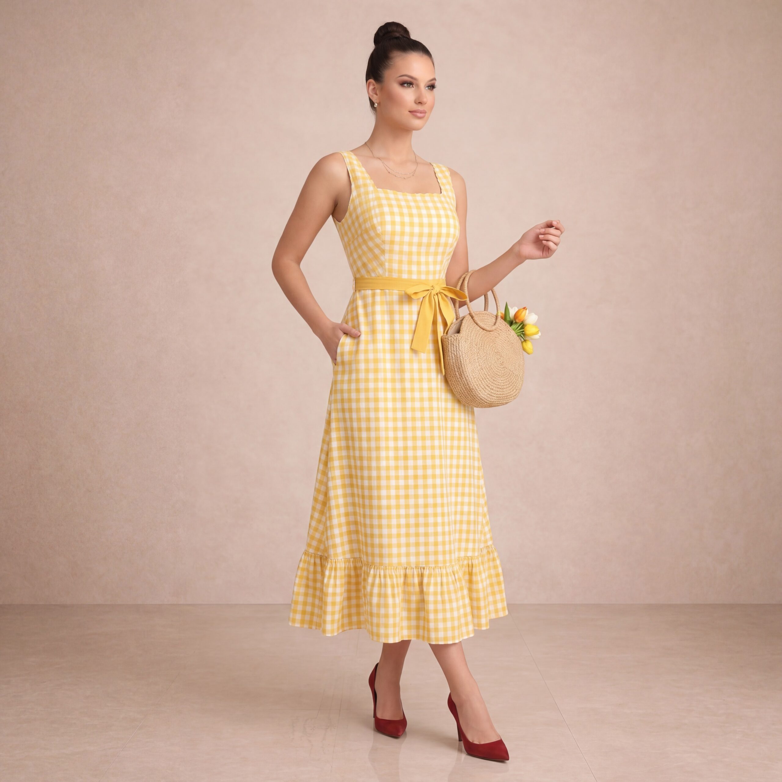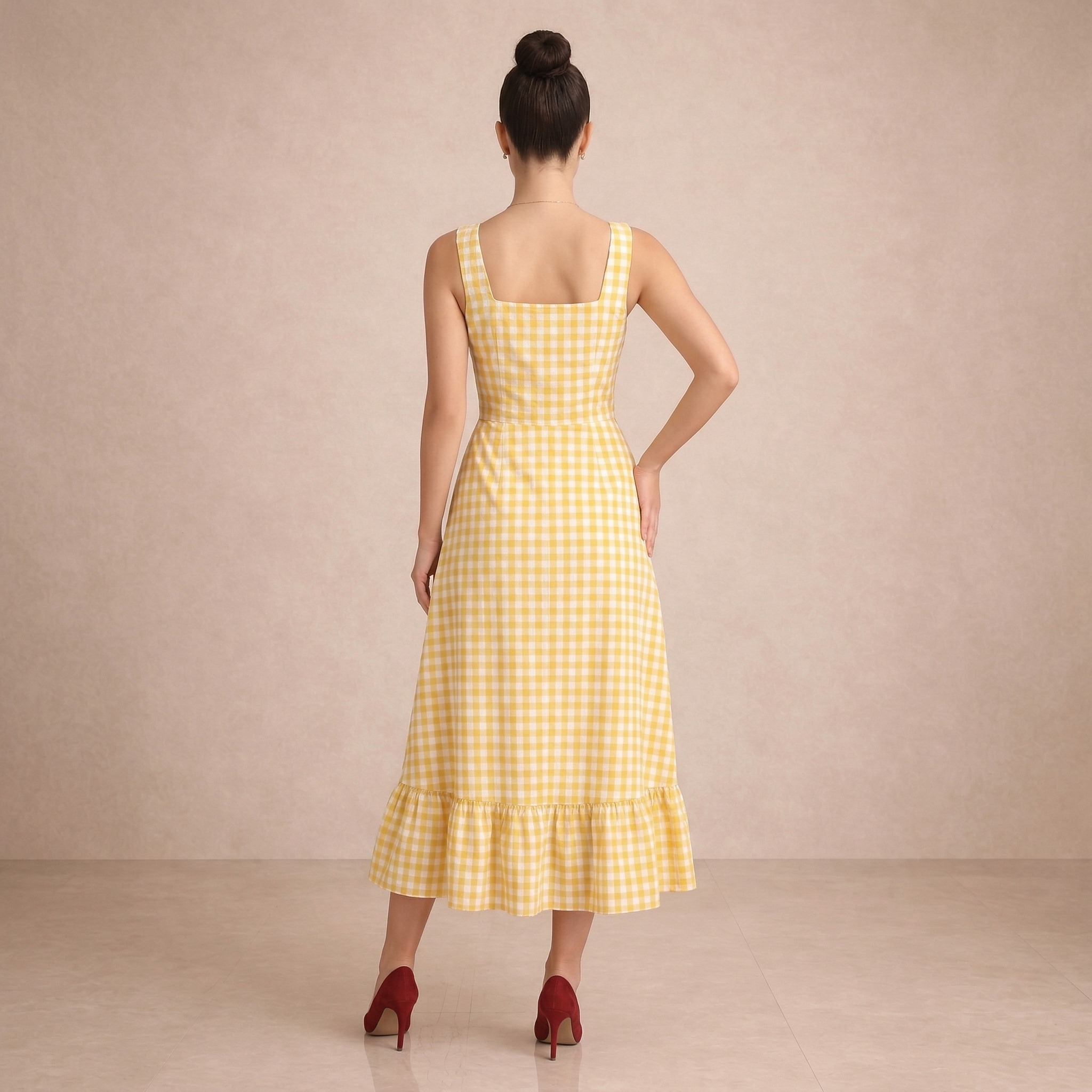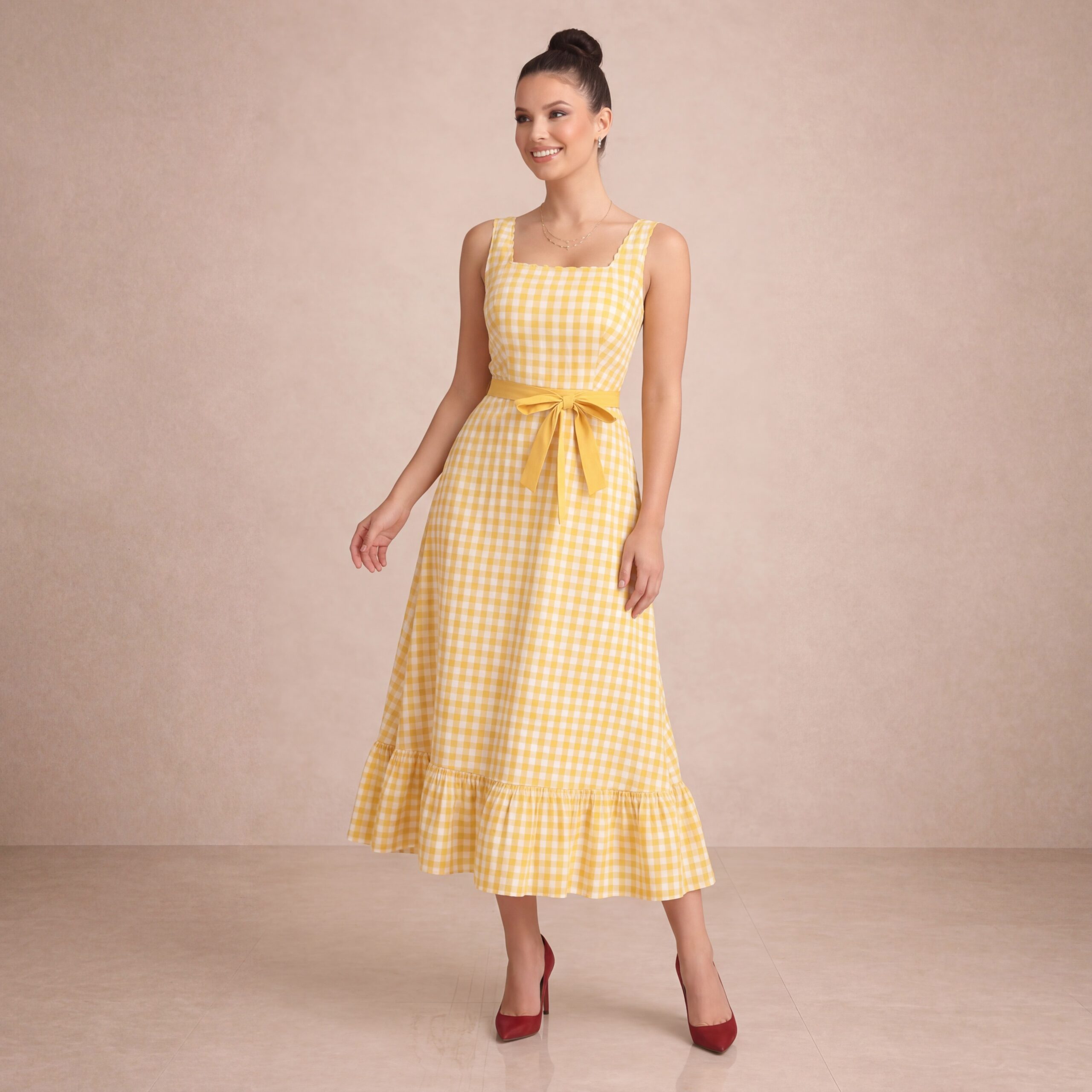 A fresh and feminine midi dress featuring a classic yellow gingham print. Perfect for sunny days, picnics, and casual outings.